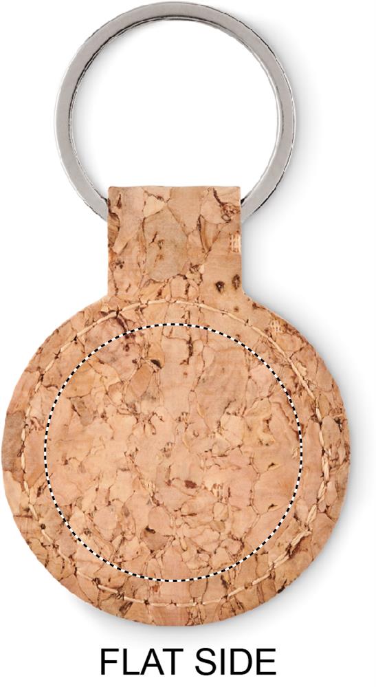 Pyöreä korkista tehty avaimenperä. Korkki on luonnonmateriaali, strukturaalinen laatu ja pinnan huokoisuus voi aiheuttaa eroavaisuuksia tuotteissa painatuksen jälkeen.