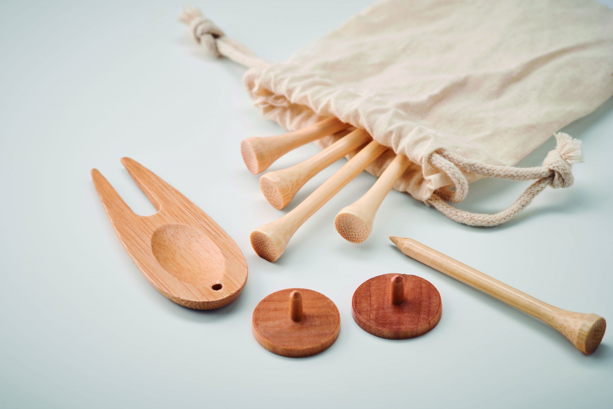 Bambusta valmistettu golfsetti puuvillapussissa, sisältää 6 golf tiitä, divotin ja kaksi puista golfpallo merkkiä. Luonnollisen materiaalin (bambu) vuoksi, tuotteiden värissä/ koossa saattaa olla erinäisyyksiä ja tämä voi vaikuttaa painatuksen lopputulokseen.
