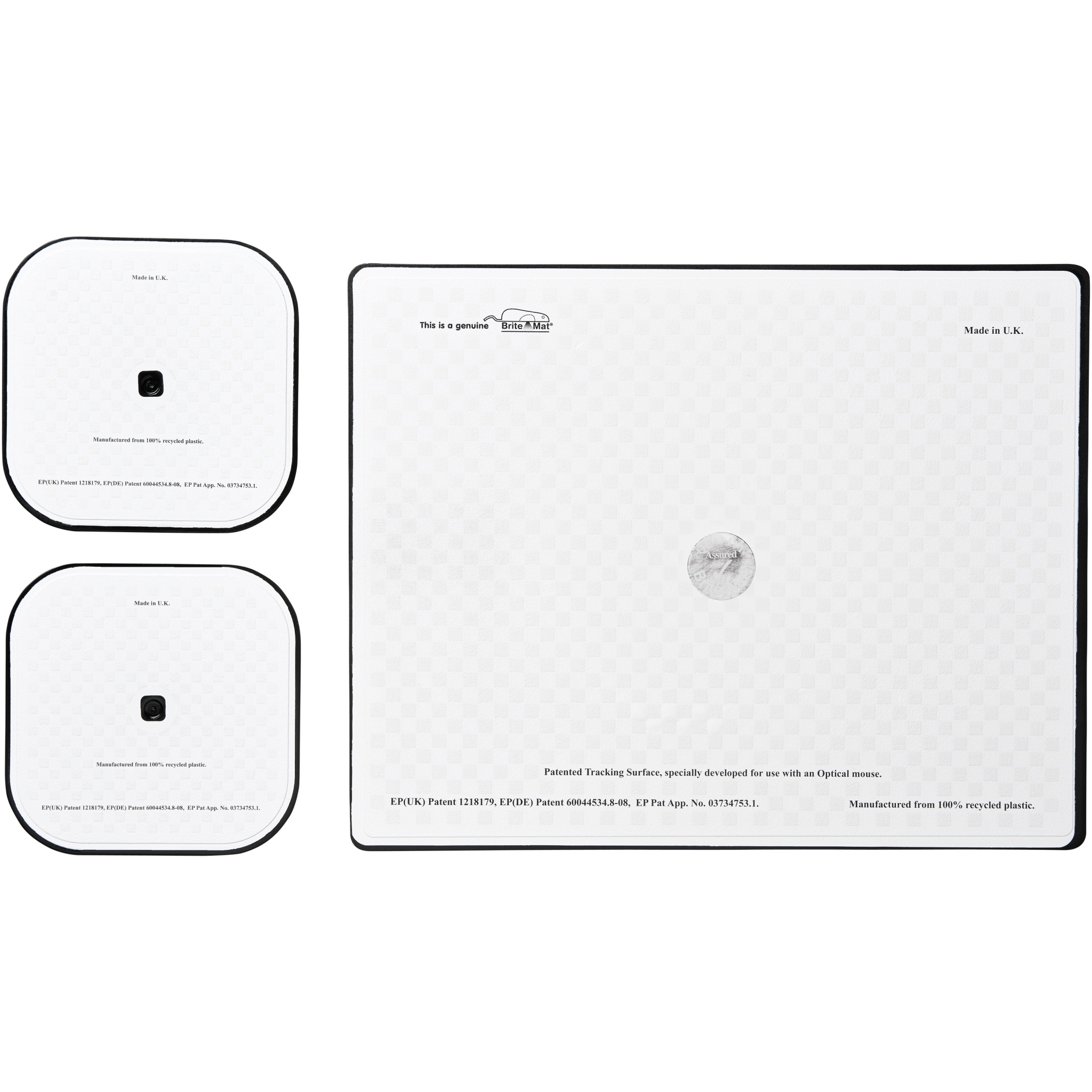 Mukana Brite-Mat-hiirimatto ja setti vastaavia lasinalusia. Settiin kuuluu suorakulmainen hiirimatto (0,3 x 19 x 24 cm) ja kaksi neliönmuotoista lasinalusta (0,3 x 9,5 x 9,5 cm).