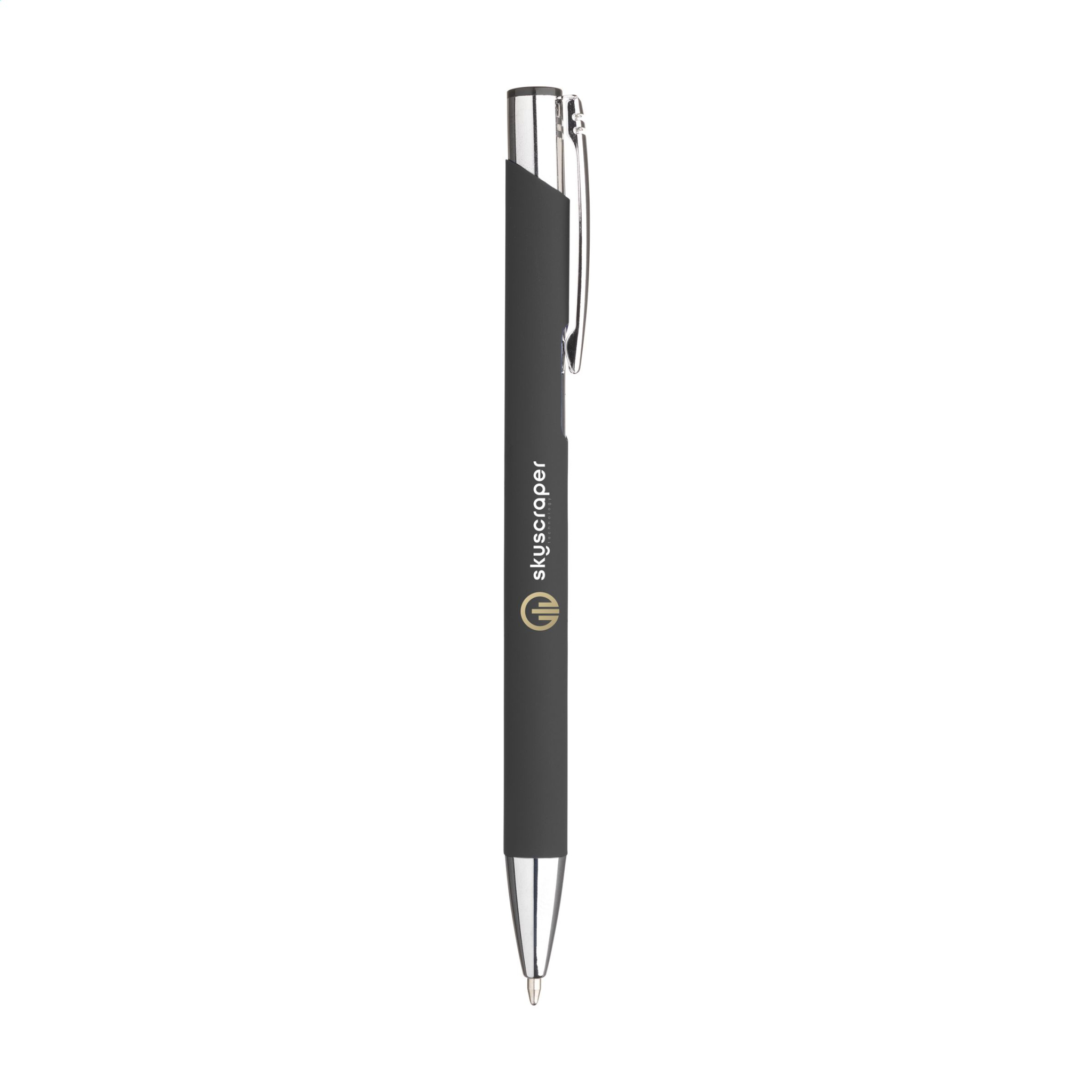 Alumiininen kuulakärkikynä metalliklipsillä ja sinisellä musteella. Tynnyri on päällystetty viehättävällä kumipinnoitteella. Tynnyri tarjoaa suuren tulostusalueen tekstille tai logolle.