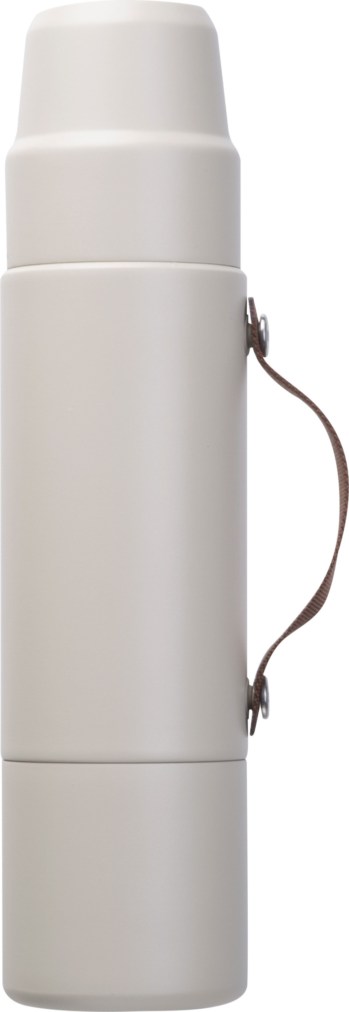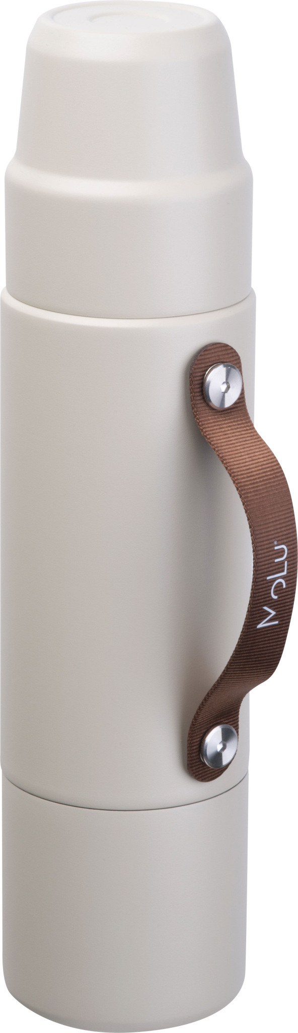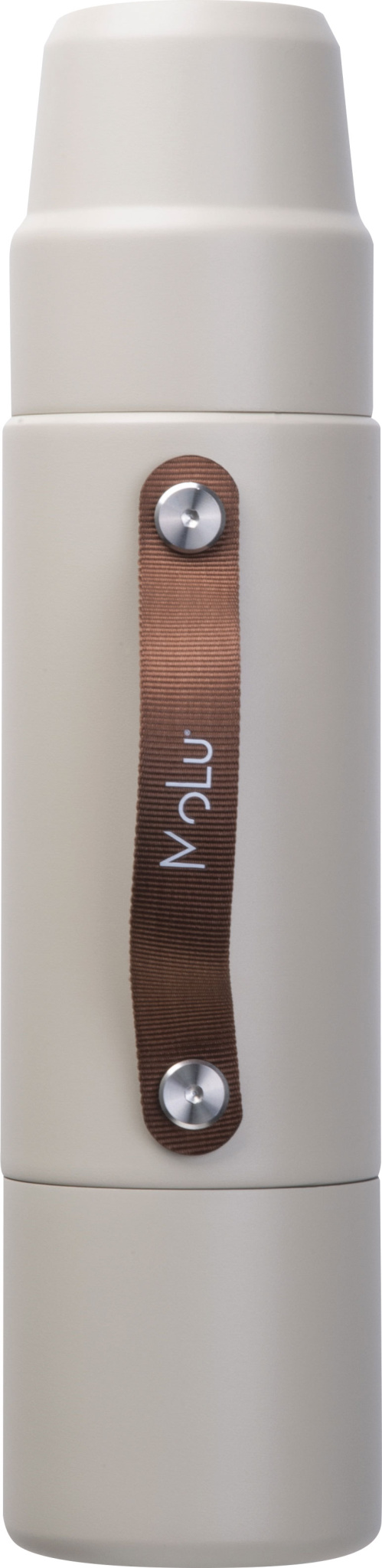 Valmistettu kierrätetystä ruostumattomasta teräksestä, kaksiseinäinen ja kuparieristetty – pitää juomat kuumina tai kylminä jopa 20 tuntia. Muotoiluun integroitu: kaksi kuppia – yksi kannessa, yksi pohjassa. Hienostunut ruskea kahva – ihanteellinen juomiseen, kaatamiseen tai kantamiseen. Huolellisesti suunniteltu, kestävä ja täydellinen mukaan otettavaksi – MoLu fiksuimmillaan.