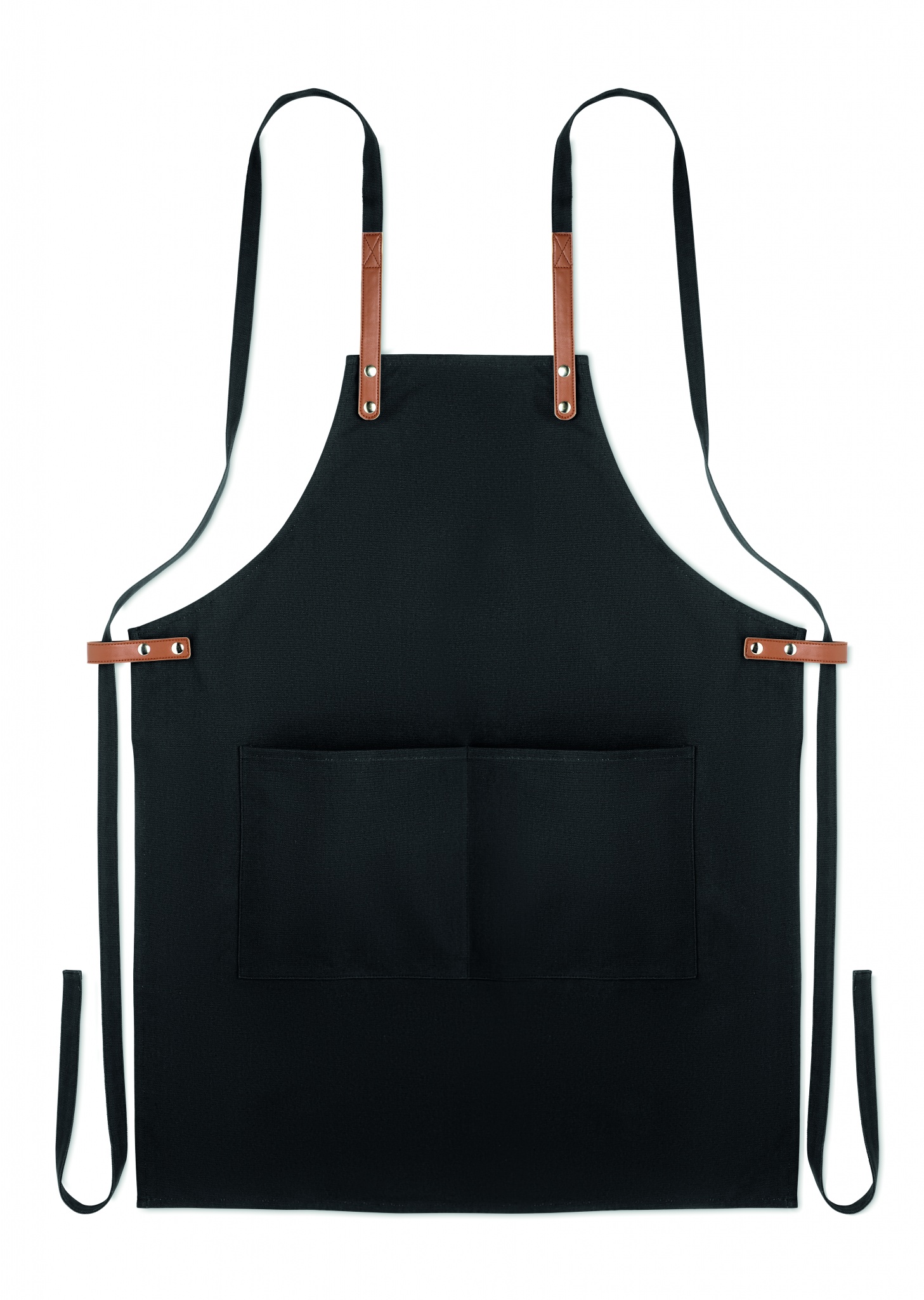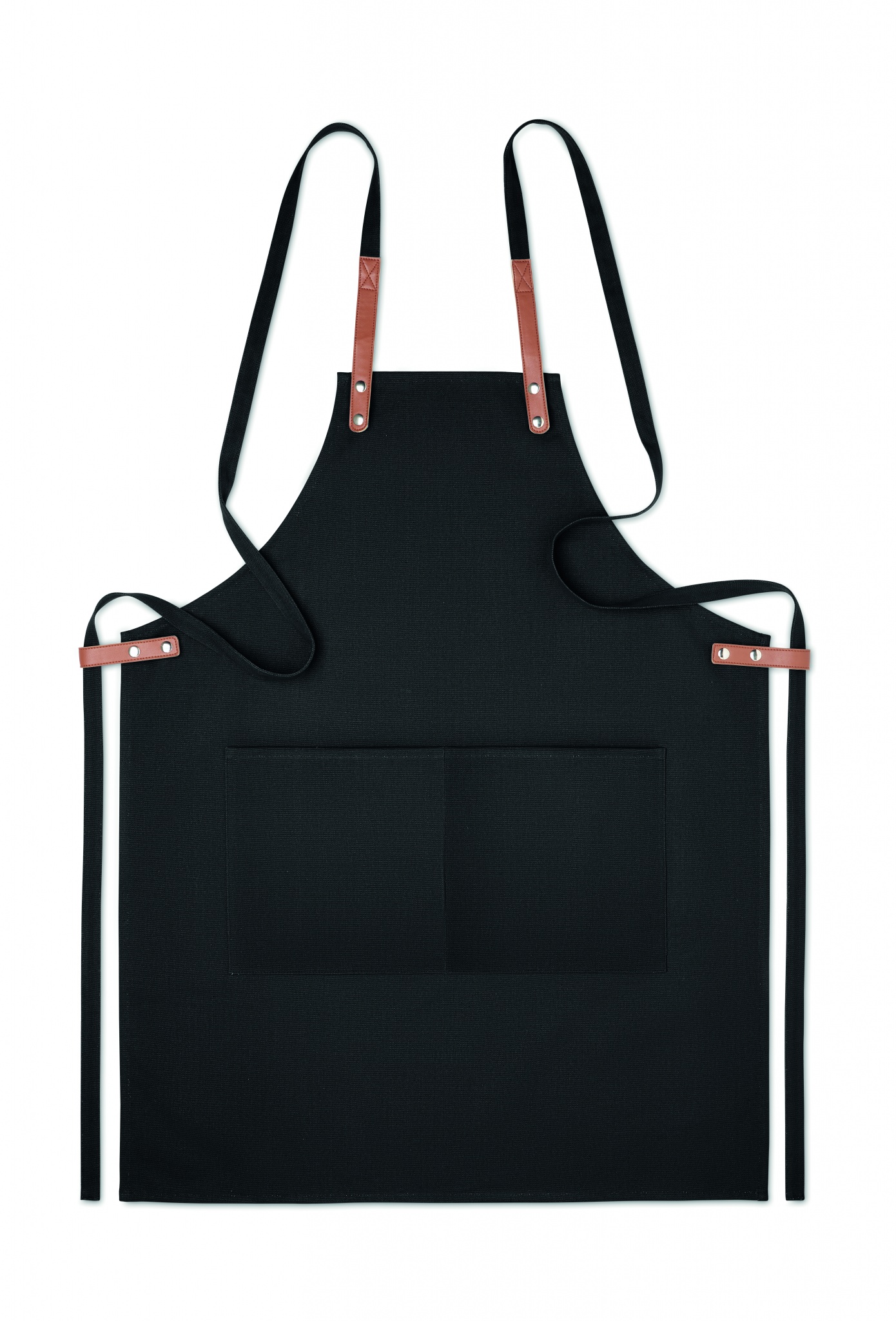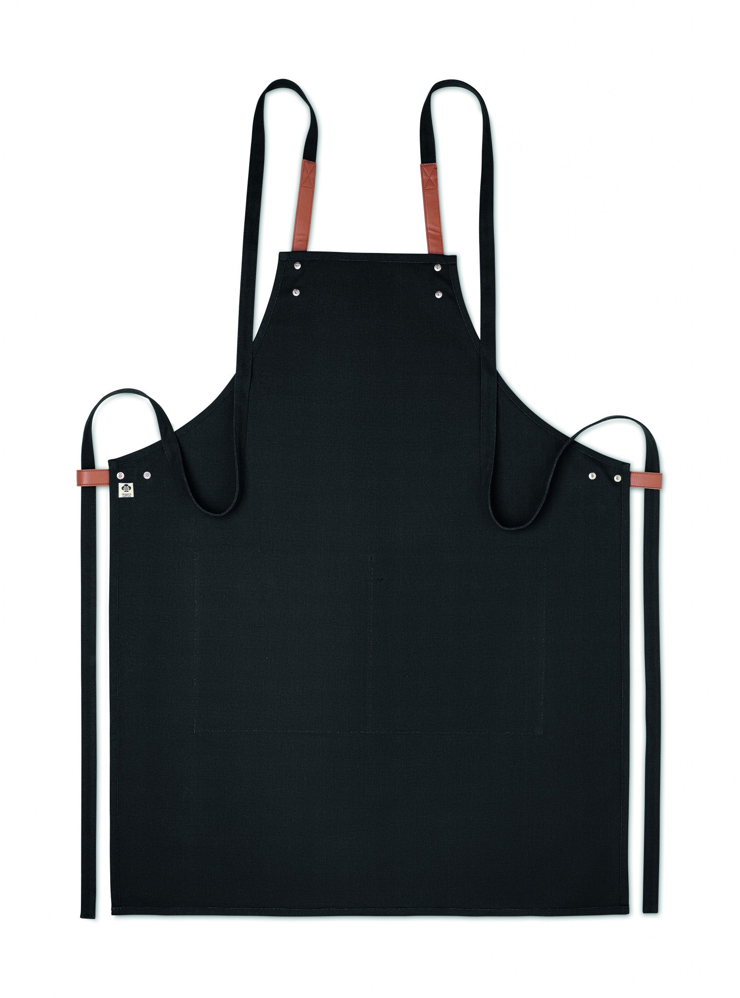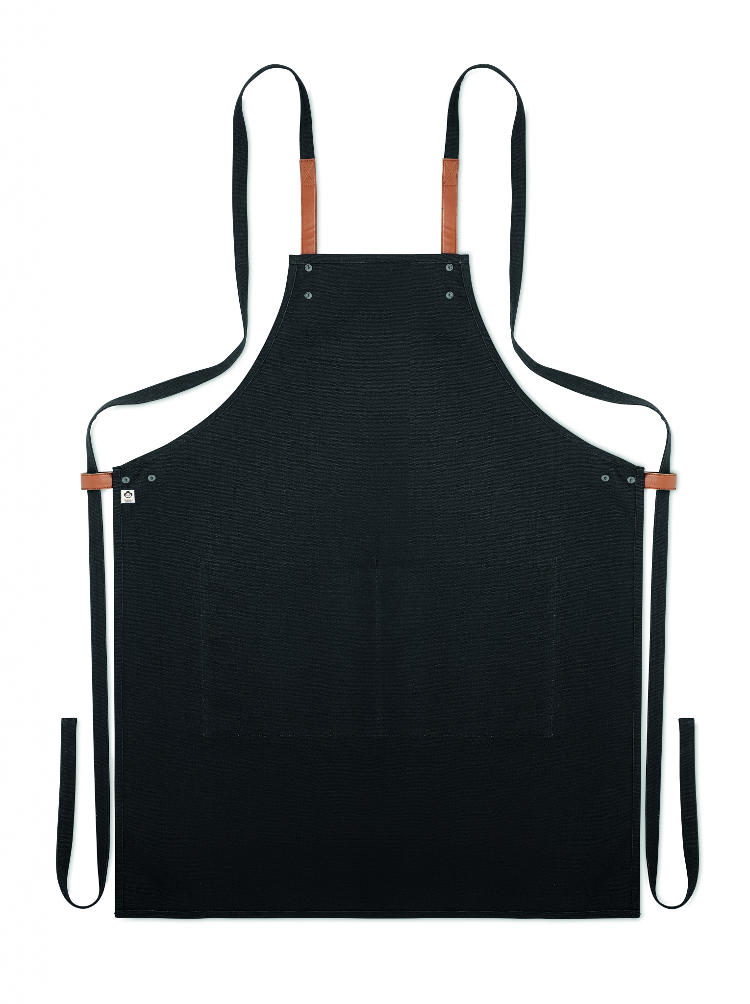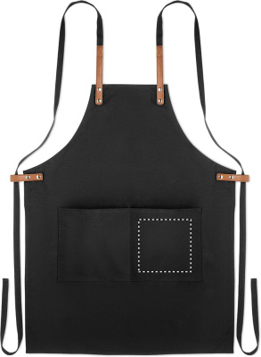 Säädettävä ja 2 etutaskulla varustettu 340 gr/m² orgaanisesta puuvillasta valmistettu esiliina.