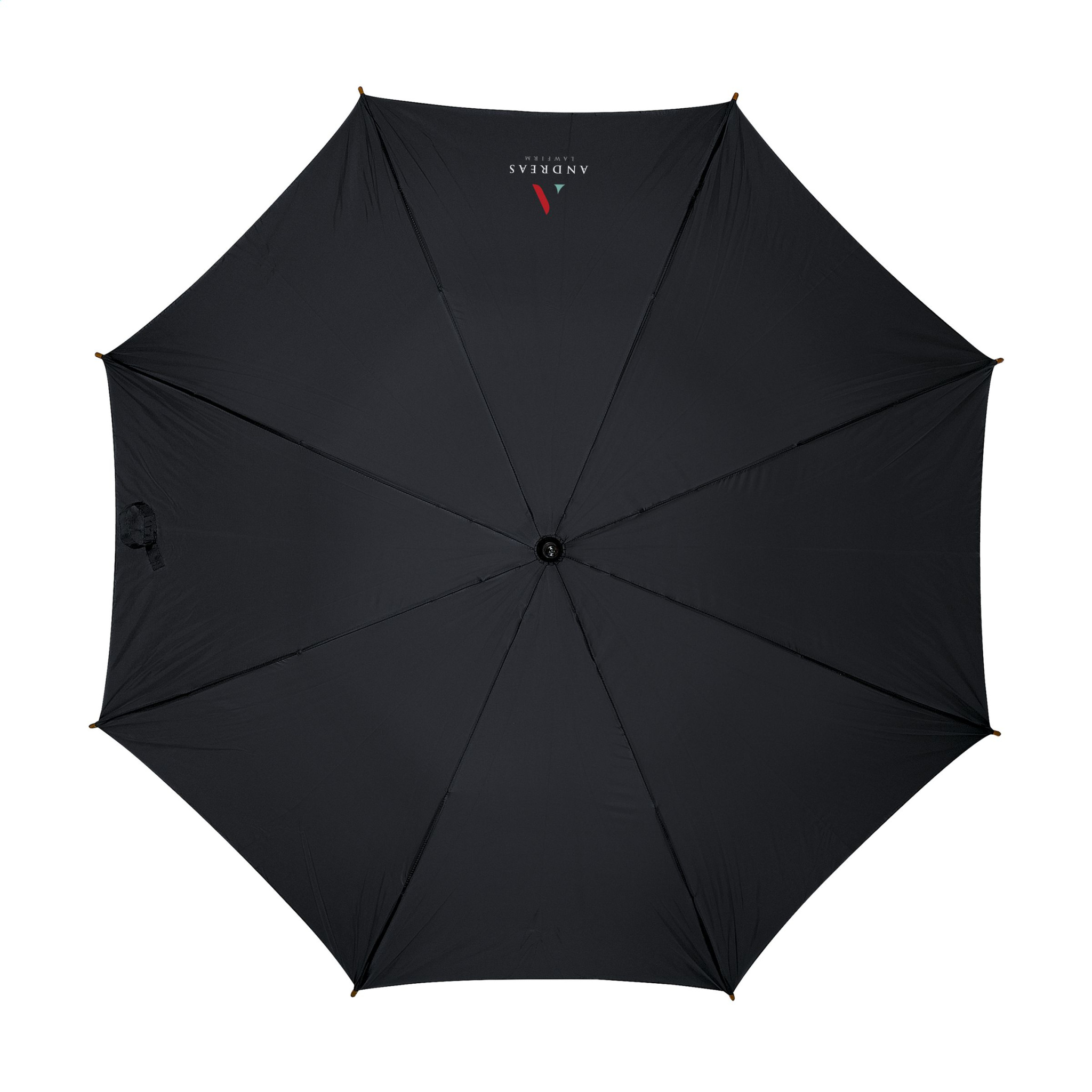 Sateenvarjo, jossa automaattinen teleskooppiaukko, 190T polyesterikatos, metallirunko, puinen varsi ja kahva sekä tarrakiinnitys.