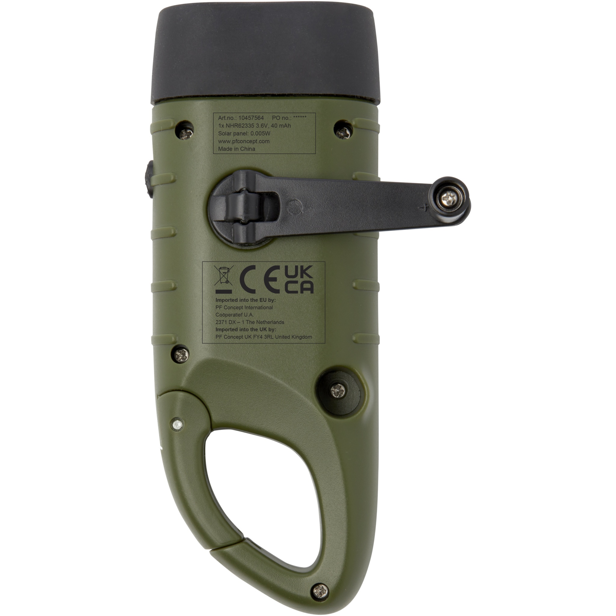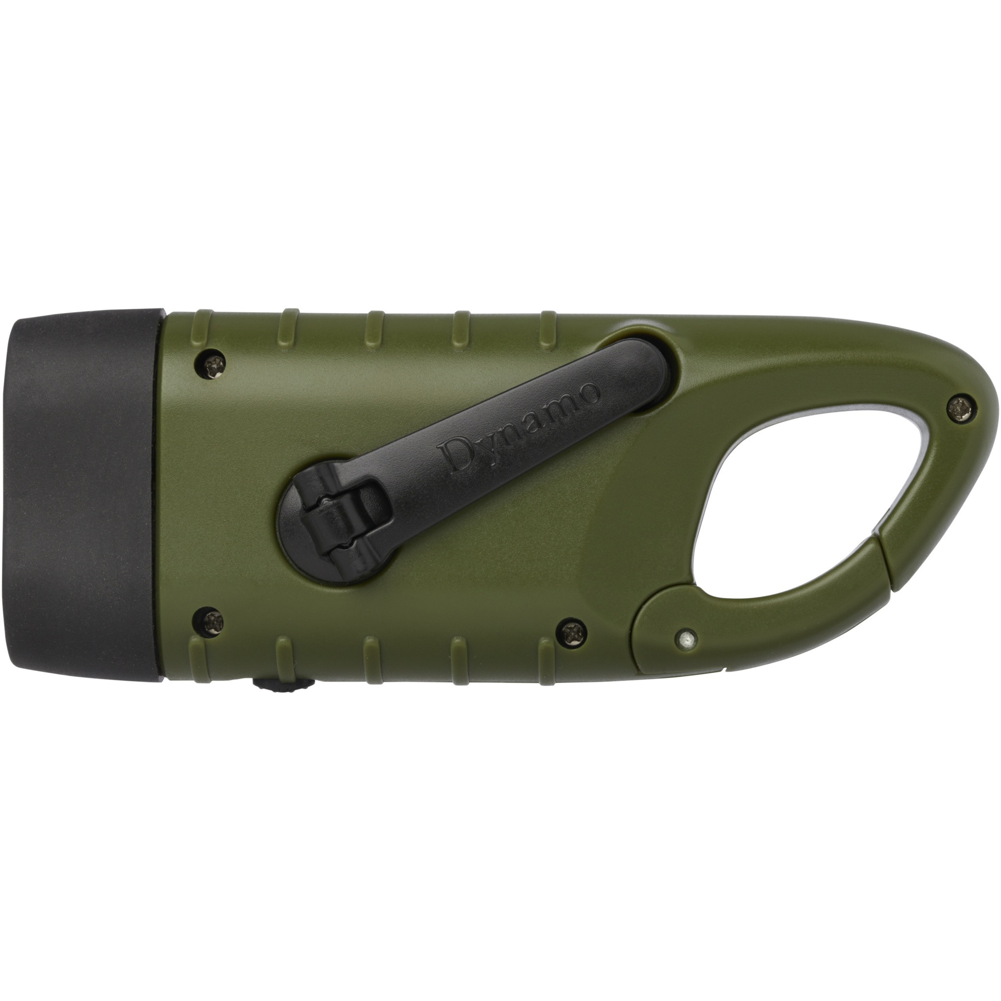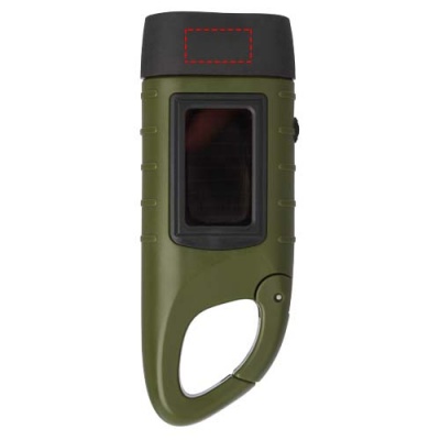Helios kierrätetystä muovista valmistettu aurinkodynamotaskulamppu karbiinihaalla, Armeijan vihreä
