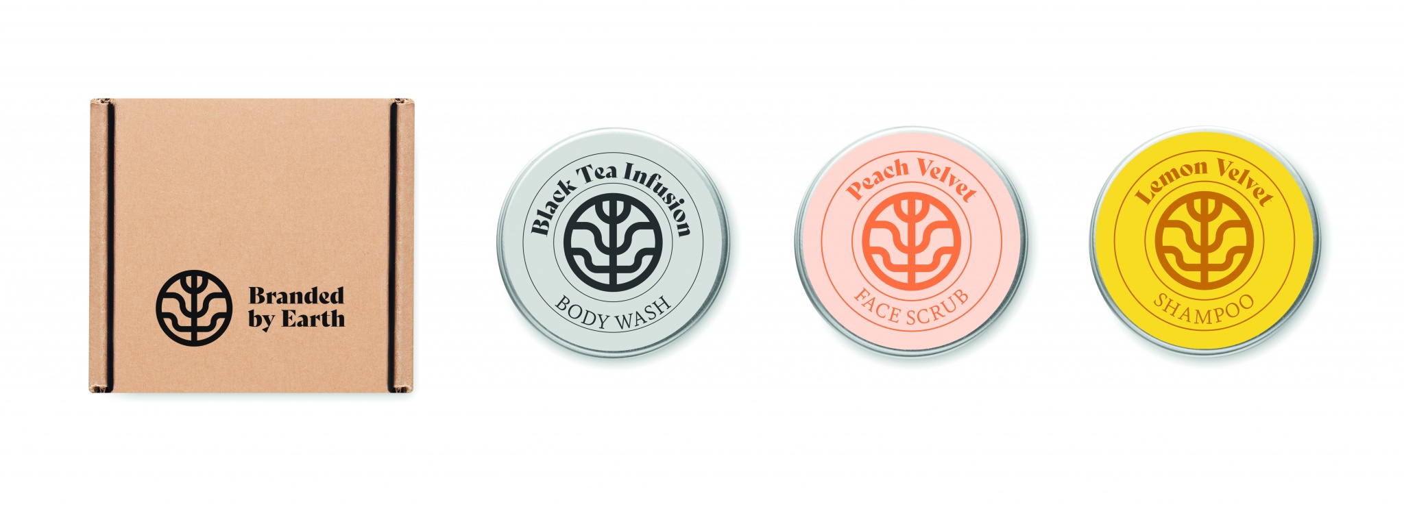 Branded By Earthin matkalahjasetti, sisältää 50 gr vegaanisen- vartalonpesuaineen, shampoon ja kasvojen kuorintaineen. Pakattuna kierrätettyyn paperirasiaan, valmistusmaa EU.