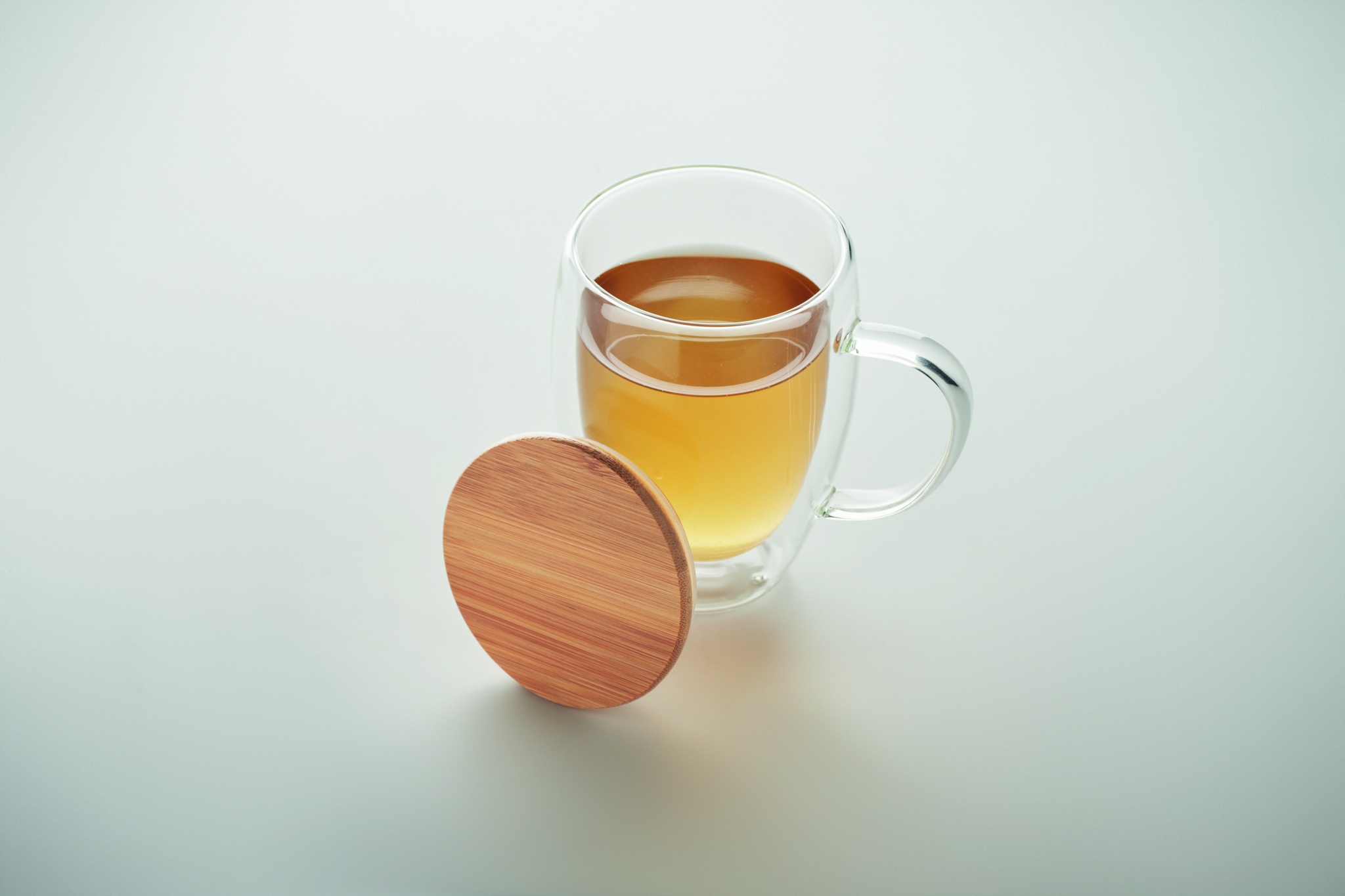 Kaksiseinäinen borosilikaattilasimuki kahvalla ja bambukannella. Tilavuus: 300 ml.