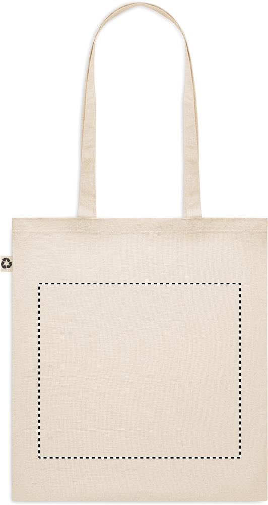 140 gr/m² kierrätetystä puuvillasta valmistettu kassi (65 % kierrätettyä puuvillaa, 35 % tavallista puuvillaa), pitkillä kahvoilla.