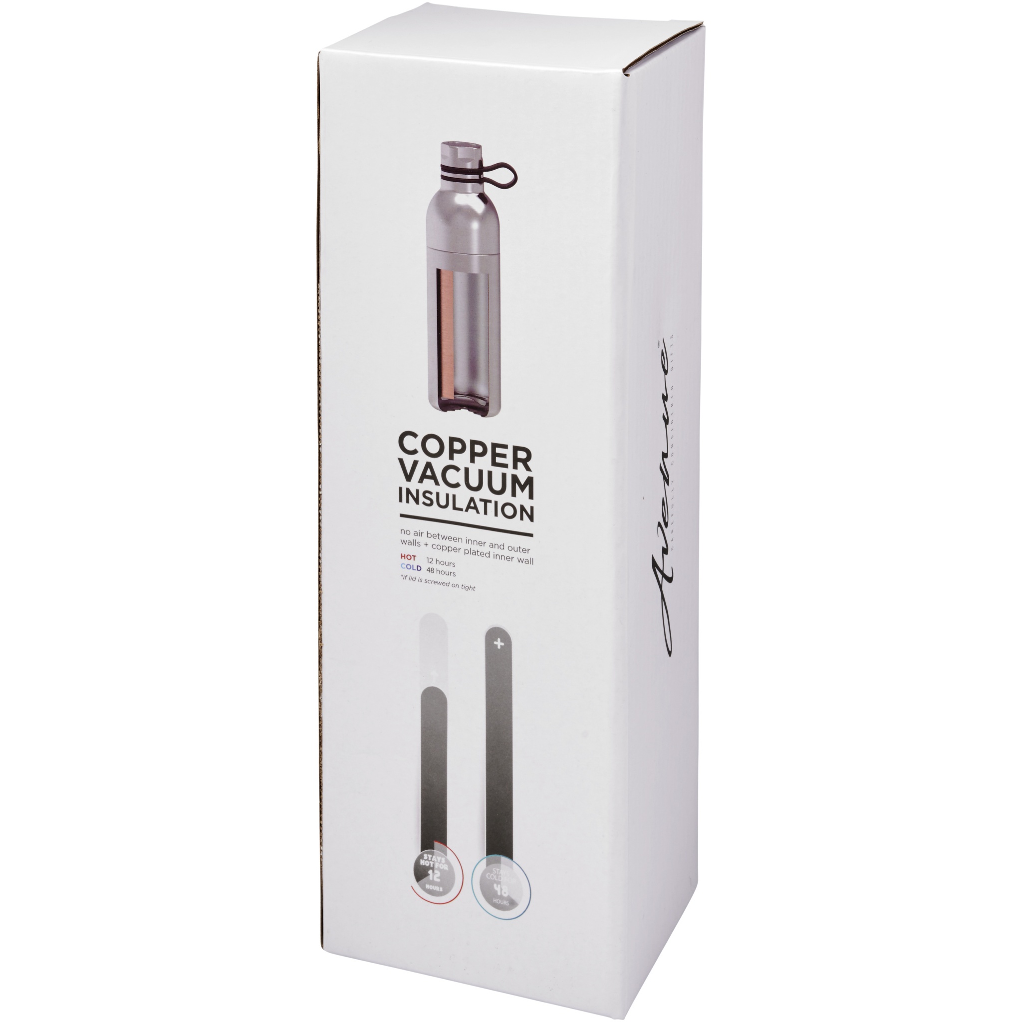 Koln 590 ml:n kuparivakuumi eristetty juomapullo. Kestävä, kaksinkertainen tyhjiörakenne kuparieristyksellä pitää juoman kylmänä 48 tuntia ja kuumana vähintään 12 tuntia. Rakenne estää myös veden kondensoitumisen pullon ulkopuolelle. Ruostumaton teräskierrekansi kätevällä silikonisella käsittelylenkillä. Kaksi suuaukkoa helpottavat pesua ja täyttöä. Tilavuus 590ml. Toimitetaan Avenue-lahjapakkauksessa.