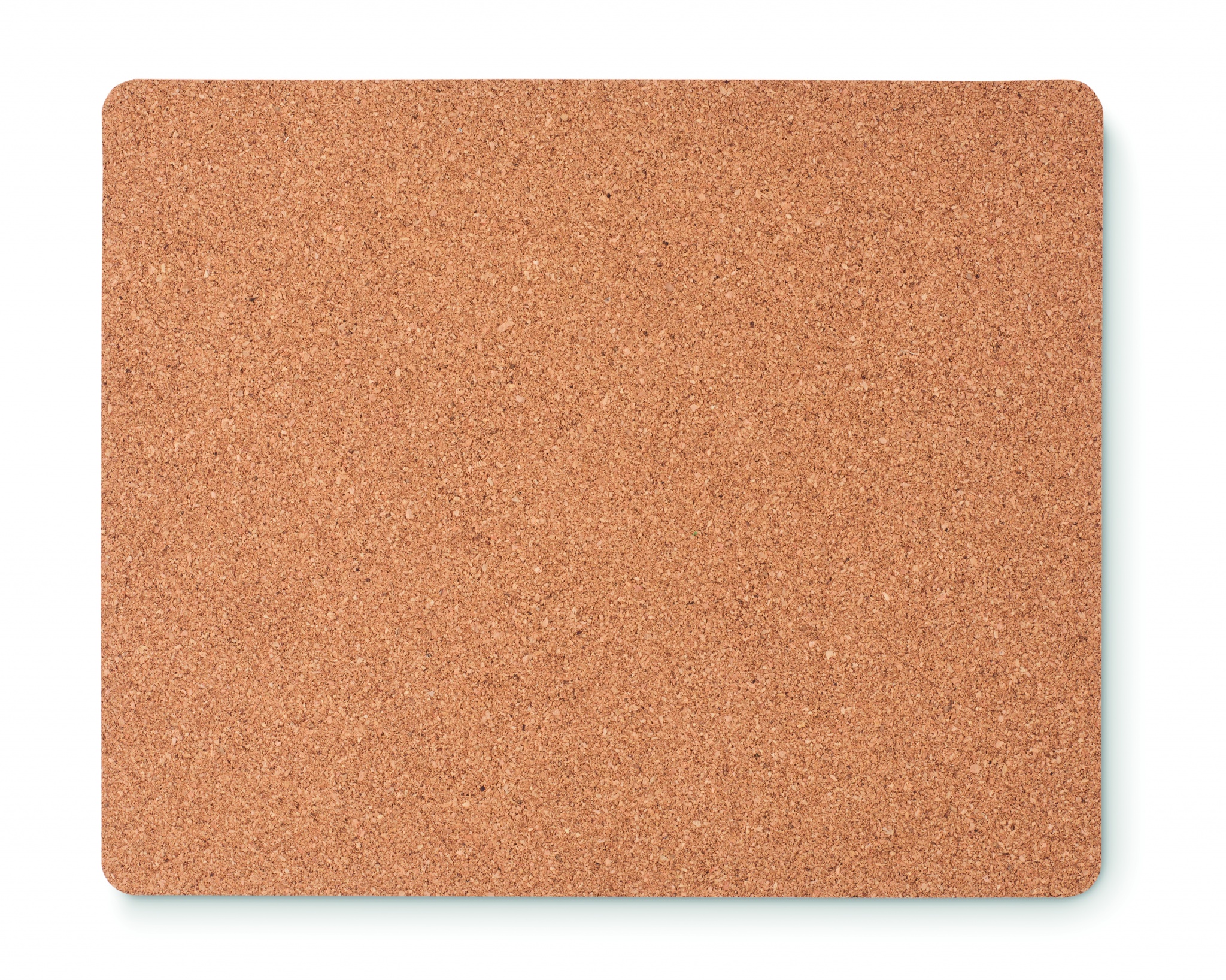 Korkista valmistettu hiirimatto. Korkki on luonnonmateriaali, strukturaalinen laatu ja pinnan huokoisuus voi aiheuttaa eroavaisuuksia tuotteissa painatuksen jälkeen