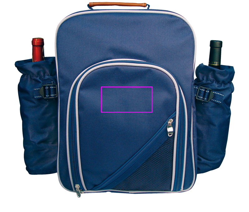Rentoudu luonnossa! Nauti mukavasta piknikistä neljälle tällä korkealaatuisella polyesteripiknik-repulla. Siinä on takana tilava jäähdytyslokero ruuan pitämiseen tuoreena, kaksi pullon jäähdytyslokeroa sivuilla, runsaasti varusteita edessä, kuten muoviastiat ja lasit, ruokailuvälineet, pieni muovitarjotin, korkkiruuvi, suola ja pippuri shaker ja veitsi. Etuosasto tarjoaa lisää säilytystilaa. Laitamme logosi etulokeroon.