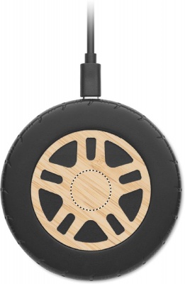 Langaton laturi 15W kierrätetystä ABS-materiaalista ja bambukannella. Auton renkaan muotoinen. Liitä laite tietokoneeseen, aseta älypuhelin sen päälle ja anna latautua. Lähtö: DC 9V/1.10A (15W) pikalatausta varten. Yhteensopiva uusimpien androidien, iPhone® 12, X ja uudempien kanssa.