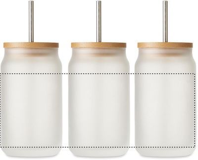 Lasipurkki, jossa on erityinen pinnoite sublimaatiopainatusta varten, bambukansi. Ruostumattomasta teräksestä valmistettu pilli. Tilavuus 400 ml.