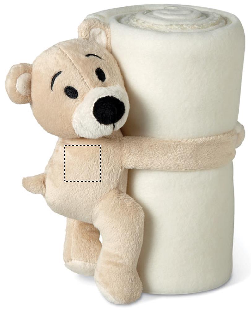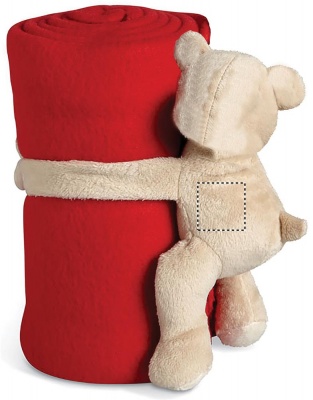Lasten fleecehuopa, nallekarhulla pitää peiton rullalla kiinnitysnauhakäsillä.