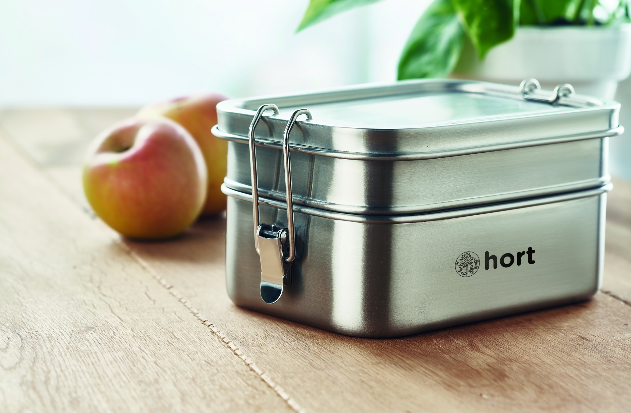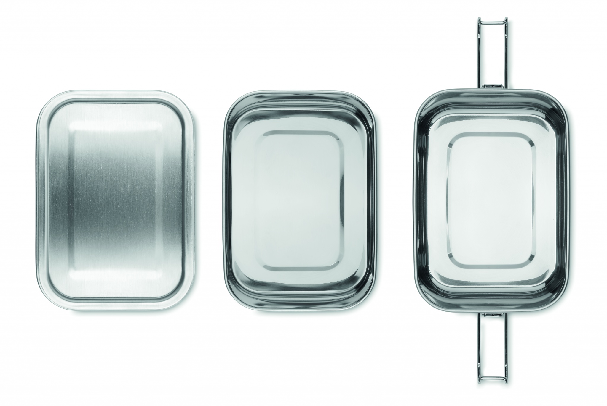 Ruostumattomasta teräksestä valmistetu 1200 ml lounasrasia, 2 lokerolla ja tukevilla sivukahvoilla.