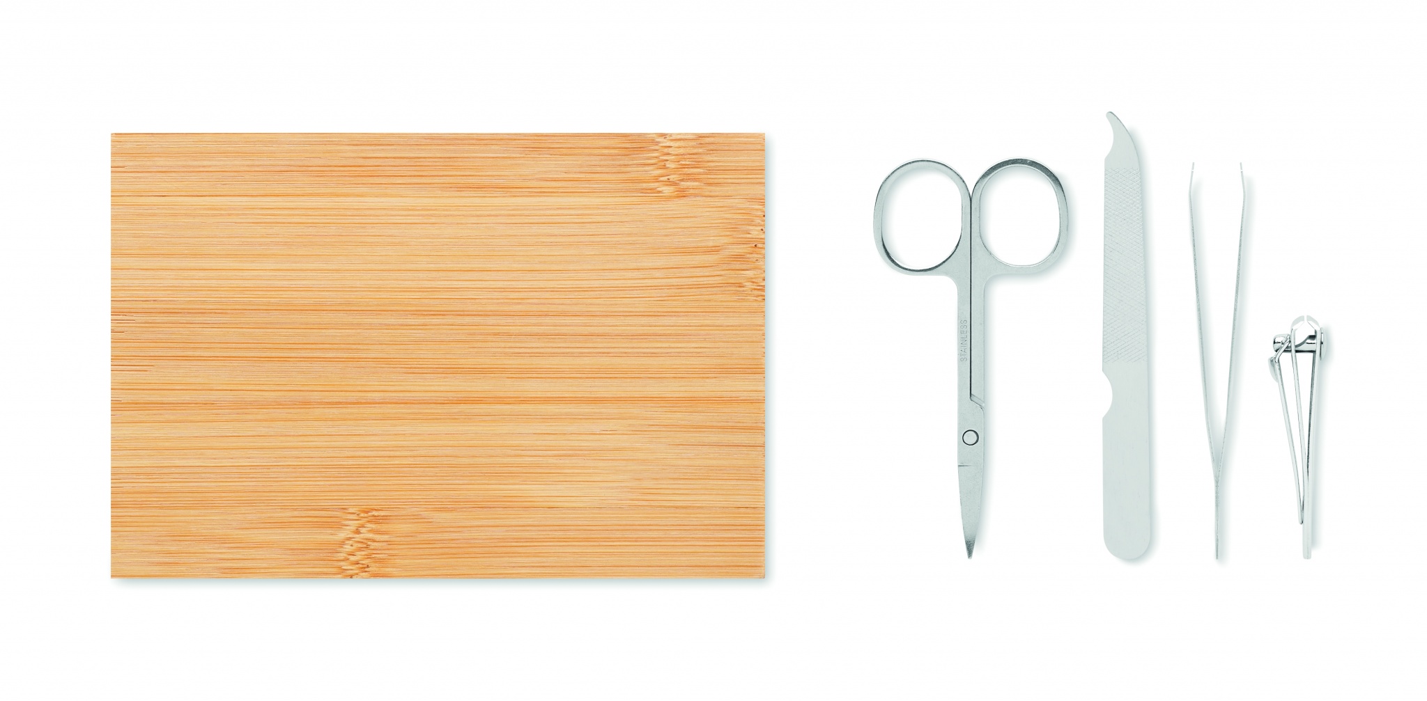 4-osainen ruostumattomasta teräksestä valmistettu manikyyrisetti bambukotelossa magneettisulkimella, sisältää kaarevat kynsisakset, kynsileikkurin, kynsiviilan ja pinsetit.