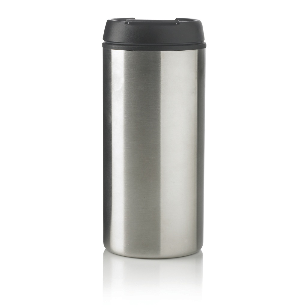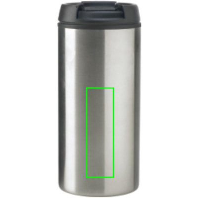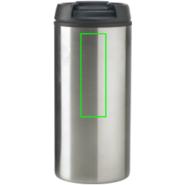 300 ml juomamuki, ulkopuoli ruostumatonta terästä ja sisäpuoli PP, musta sulkumekanismi. Rekisteröity design®