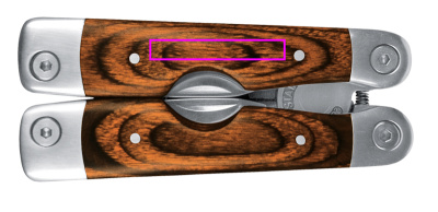 Ruostumattomasta teräksestä valmistettu monitoimityökalu, jossa tyylikkäät puukuoret kahvoissa: isot pihdit leikkaustoiminnolla, pieni saha mittayksiköllä ja viilalla, veitsi, Phillips-ruuvimeisseli, kolme eri leveyttä ruuvimeisseliä, pieni veitsi kaapelieristeen poistoaineella ja tölkinavaaja. Monitoimityökalu toimitetaan vyöpussissa, joten voit aina kuljettaa sitä mukanasi. Kaiverremme logosi kahvaan.
