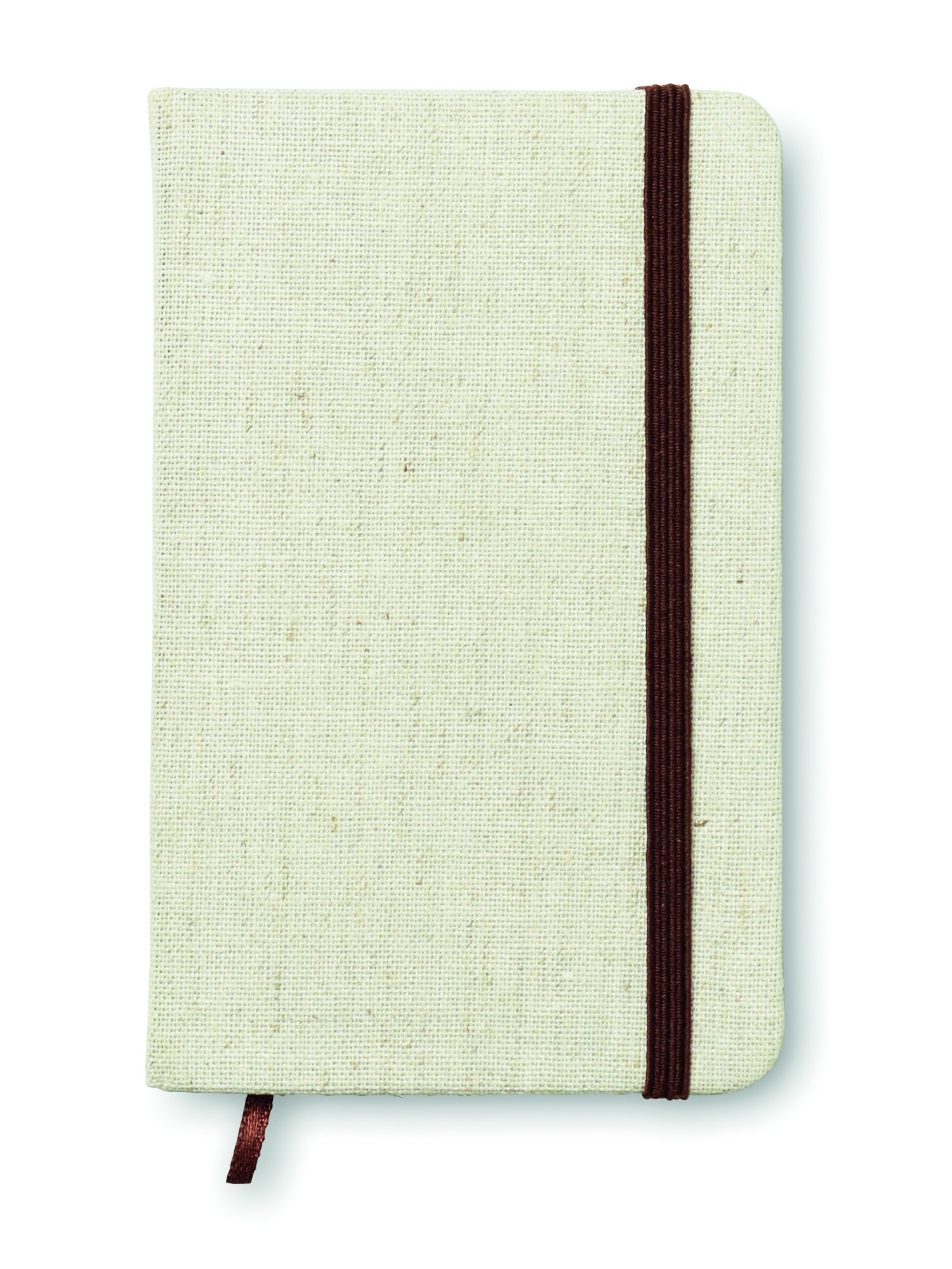 A6 notebook with hard canvas cover. Casebound. 192 lined pages (96 sheets). Contrasting elastic closure strap and ribbon page-marker.