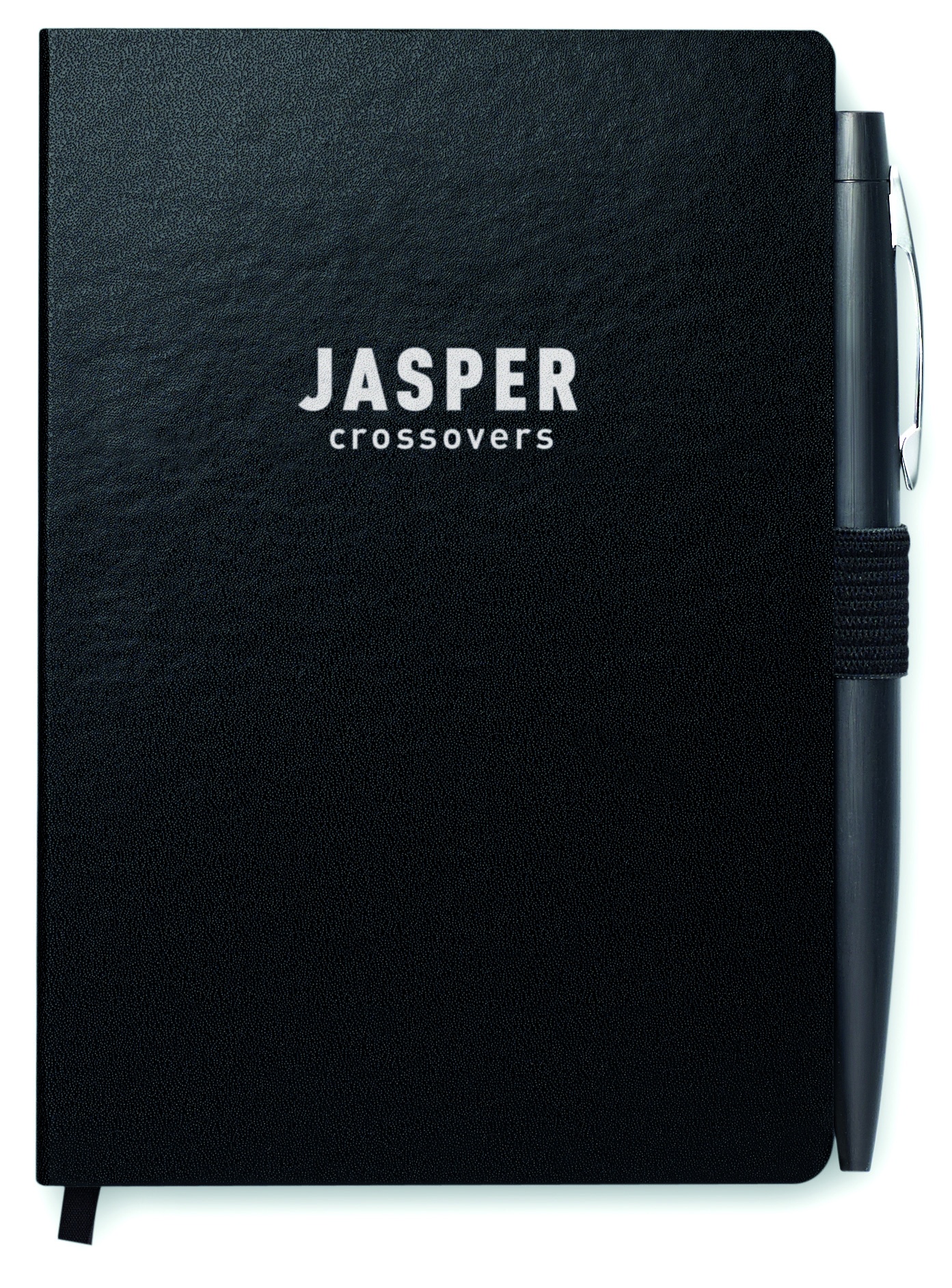 A6-muistikirja kartonki kannella, 72 sivua viivattua paperia, kuminauhalla ja kirjanmerkkinauhalla. Sisältää metallisen kuulakärkikynän sinisellä musteella.