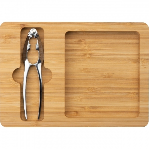 Kaunis bambukulho metallisella pähkinänsärkijällä. Tee logoviestillesi erityisen maukas asetus tällä artikkelilla. Painamme logosi bambukulhoon laserkaiverruksella.