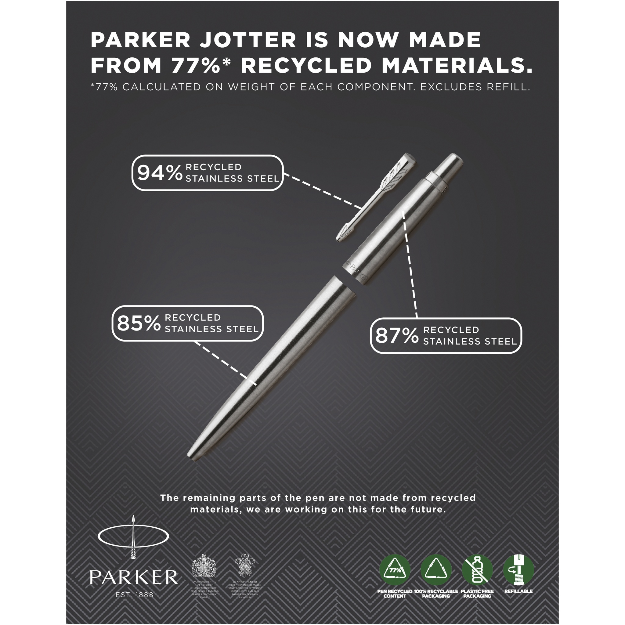 Parkerin ikoni, Jotter on haluttu tuote ahkerille kirjoittajille, jotka tarvitsevat kynää kaikkialla. Mukana Parker-lahjakotelo sekä yksi mustesäiliö. Eksklusiivinen muotoilu.