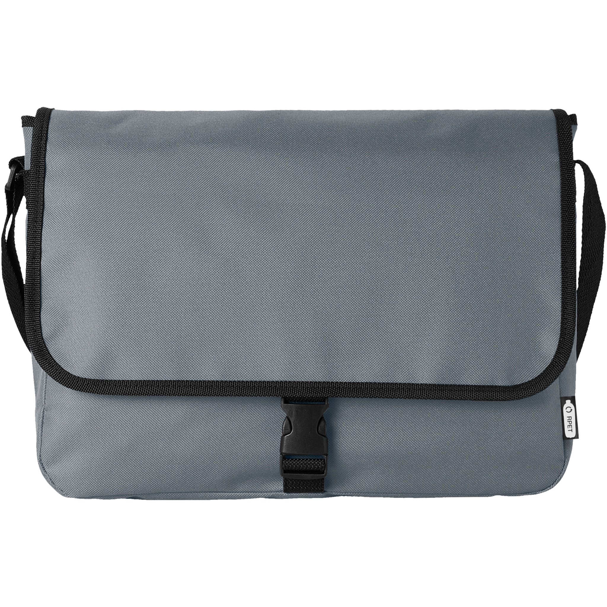 Kierrätetystä PET-muovista valmistettu olkalaukku säädettävällä olkahihnalla. Päälokero suljetaan läpässä olevalla soljella.