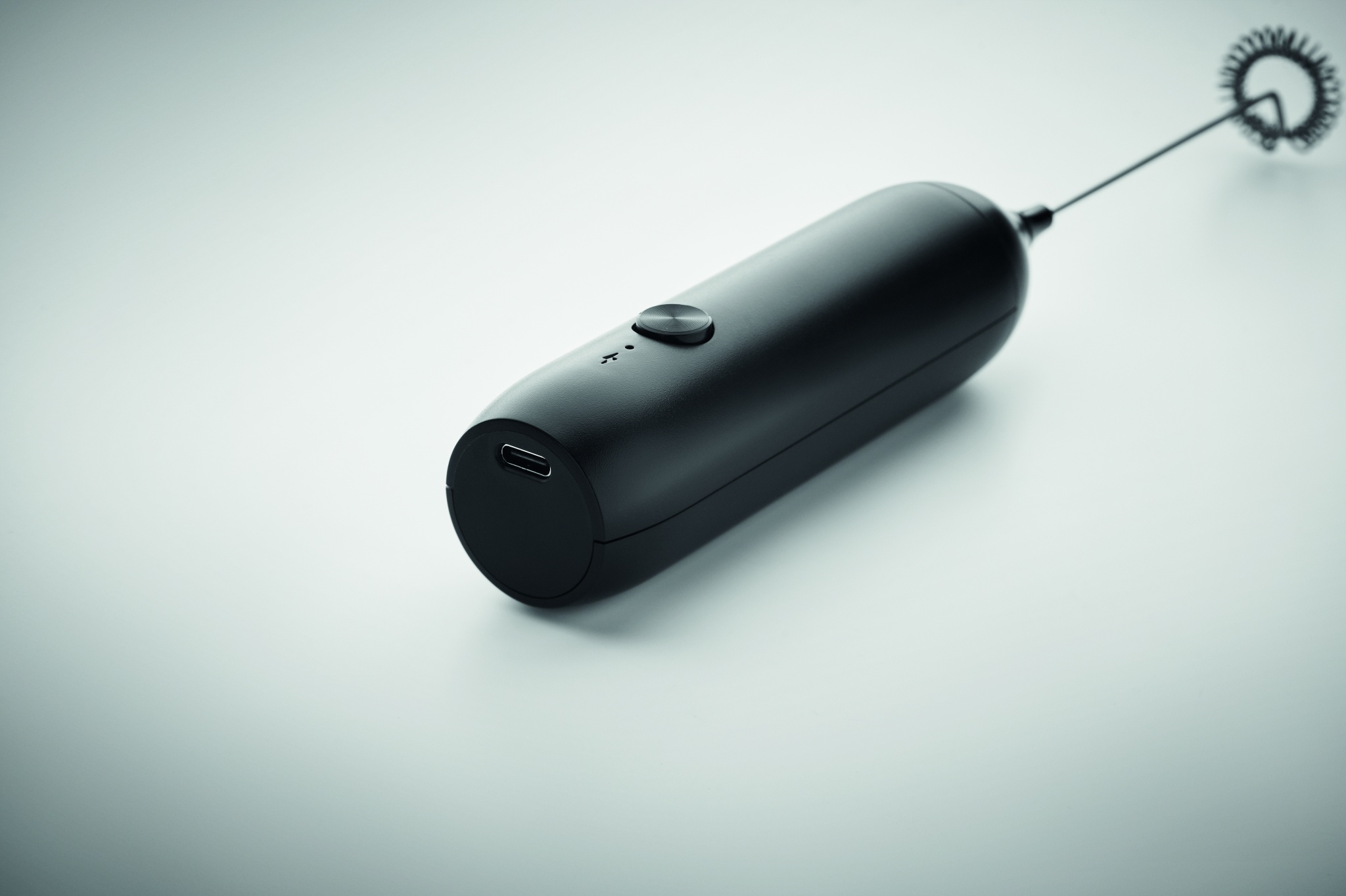 Kädessä pidettävä sähköinen ABS-maidonvaahdotin mattapintaisella pinnalla. Sisäänrakennettu akun kapasiteetti 500 mAh. USB Type-C ladattava (kaapeli mukana). Nopeus: 10 000 rpm.