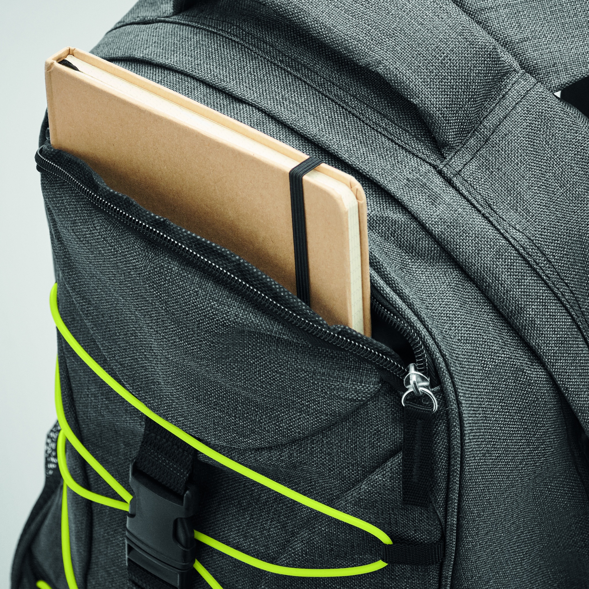 600D 2 sävyinen polyesteri reppu, pimeässä hohtavilla kontrasti nauhoilla ja sivuilla verkkotaskut.