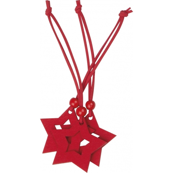 Kolmen punaisen huopatähden setti nyörillä ja puuhelmillä, koristeellinen paitsi joulun aikaan. Logosi kiinnitetään yksittäiseen pakkaukseen etiketin mukaan.