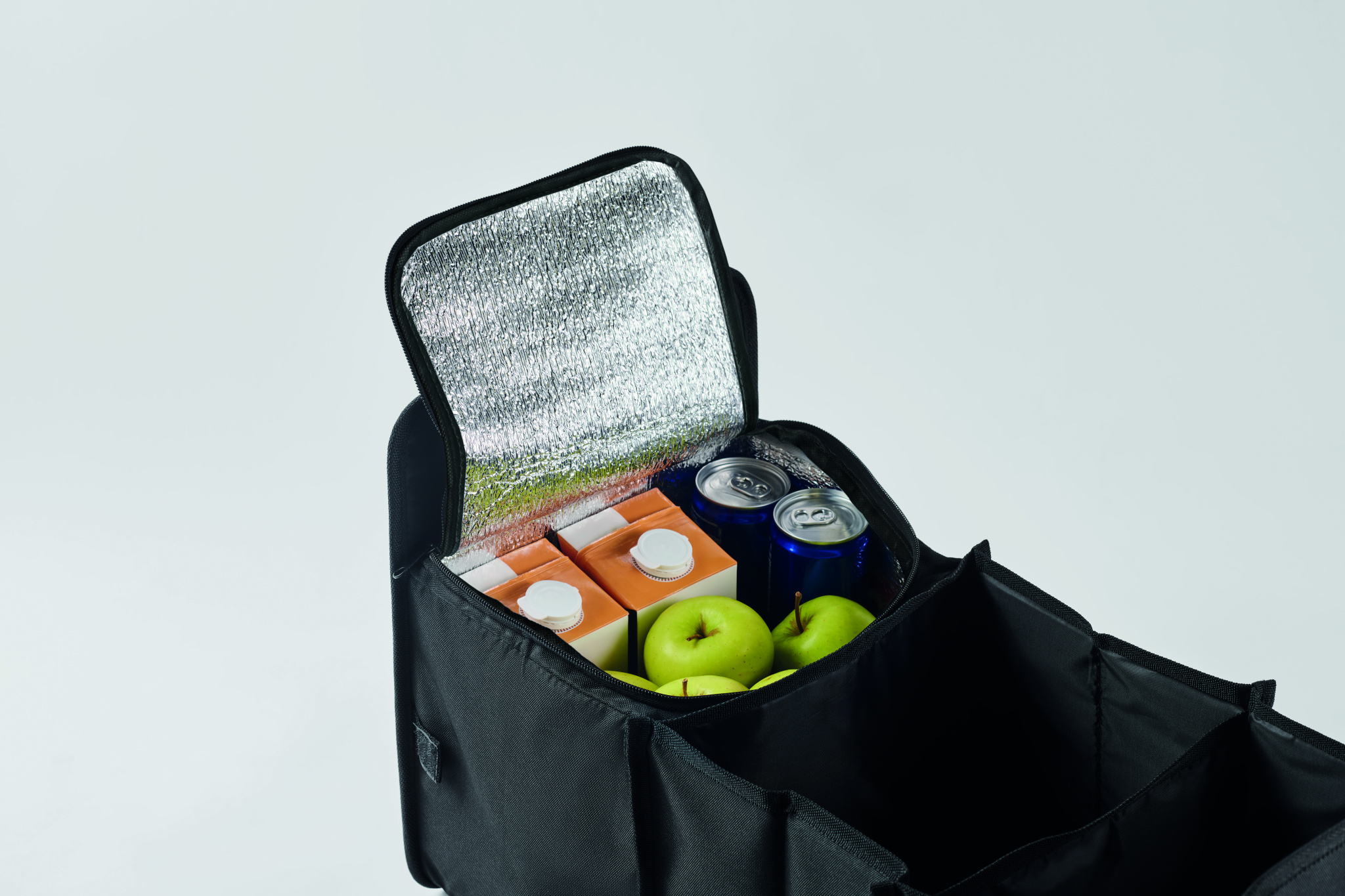 Kokoontaitettava autonjärjestäjä 600D RPET-polyesteristä, 3 lokeroa, joista yksi kylmälokero.
