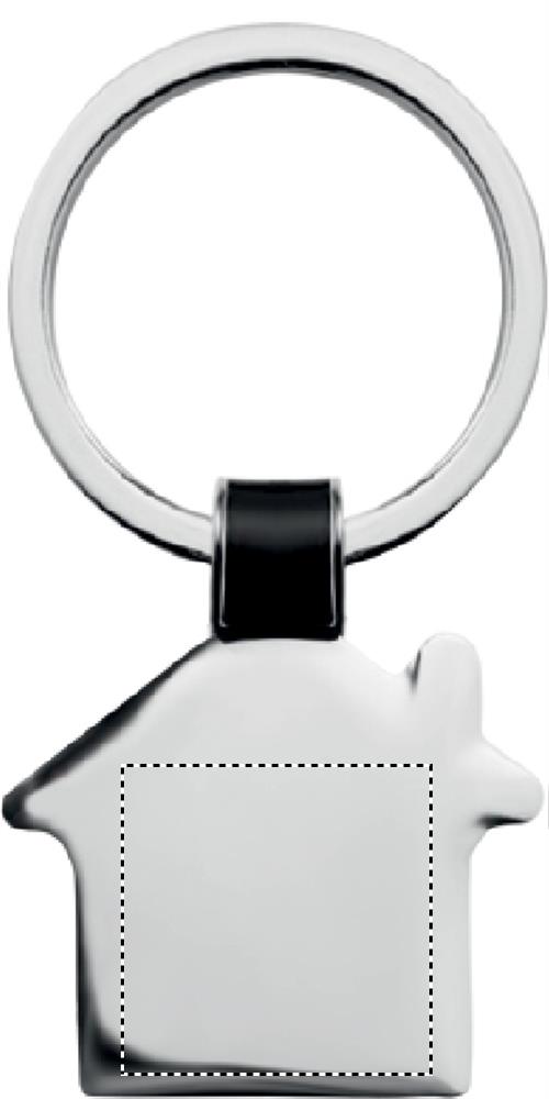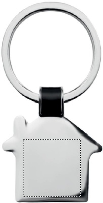 Metallinen avaimenperä talon muodossa, kiiltävä nikkeli viimeistely.