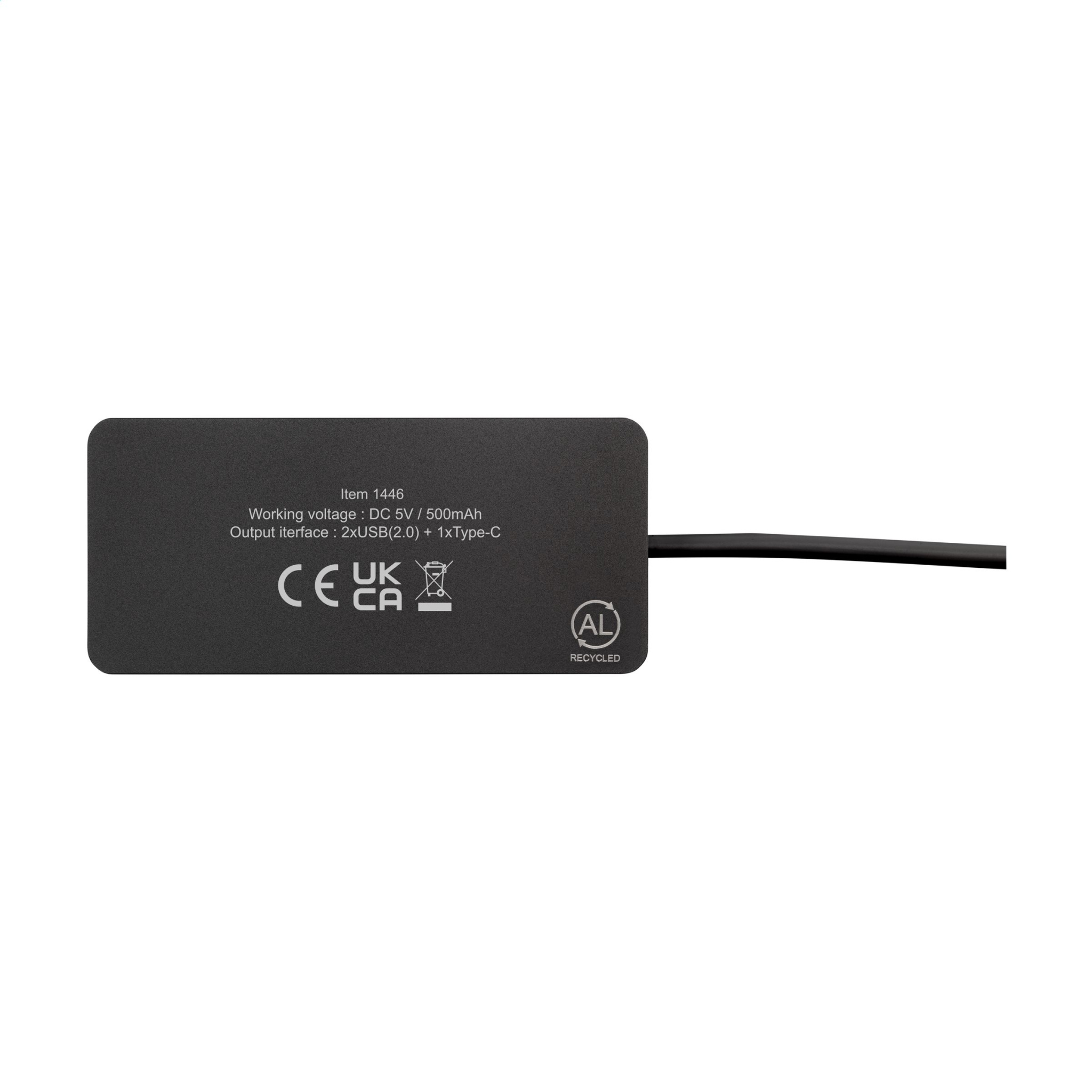 Kompakti, kevyt 2.0 USB-keskitin. Kotelo on valmistettu 100 % GRS-sertifioidusta kierrätetystä alumiinista. Varustettu 3 USB-portilla: 1 USB-A 2.0 -portti ja 2 Type-C -porttia lisälaitteiden liittämistä varten. Mukana yhteensopiva musta kaapeli, jossa on kaksoistuloliitin, joka sopii sekä tyypin c että USB-A tietokoneille. Kierrätysmateriaali yhteensä: 50 %. Käyttämällä kierrätettyä alumiinia tämän tuotteen valmistuksessa käytetään vähemmän uusia raaka-aineita. Tämä tarkoittaa vähemmän energiankulutusta ja vähemmän veden käyttöä. Vastuullinen valinta. Jokainen tuote on pakattu erikseen.