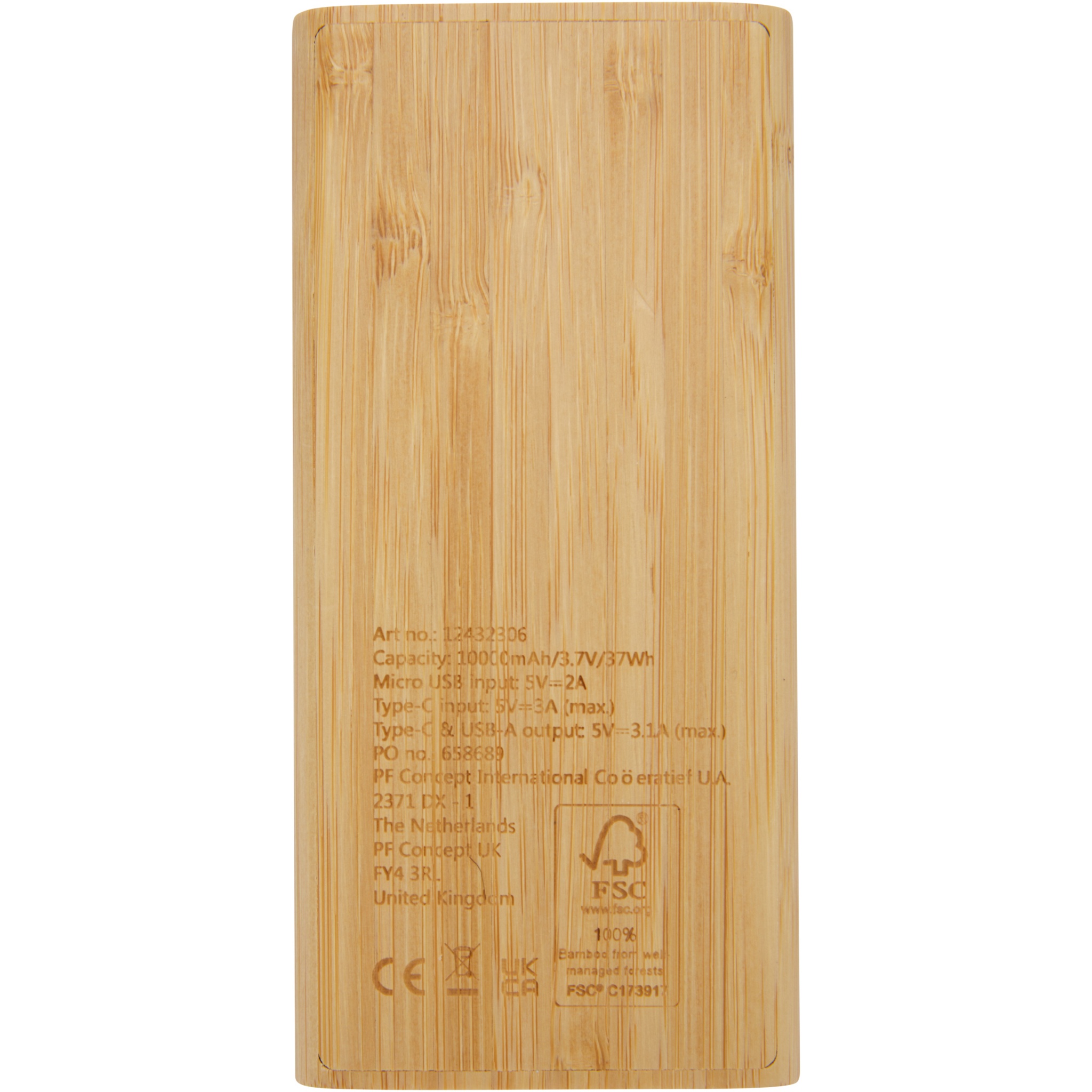 Bambusta valmistettu 10 000 mAh:n varavirtalähde, jossa on ON/OFF-kosketuspainike ja jäljellä olevan akkukapasiteetin näyttö neljällä LED-merkkivalolla. Micro USB-tulo 5 V/2 A, Type-C-tulo 5 V/3 A, Type-C-lähtö 5 V/3,1 A maks., kaksi USB-A-lähtöä 5 V/3,1 A maks., kokonaisteho 15,5 W. Mukana toimitetaan 30 cm:n TPE 3A Type-C - Type-C -latauskaapeli, käyttöohje ja voimapaperista valmistettu lahjapakkaus. Koska bambu on luonnollinen tuote, tuotteen värissä ja koossa voi olla pieniä eroja, jotka voivat vaikuttaa logomerkinnän lopulliseen ulkonäköön.