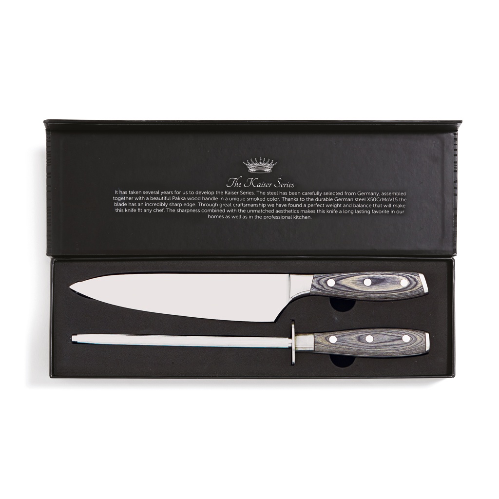 Kaiser-sarjan kokkiveitsi ja teroitusterä. Veitsi on valmistettu saksalaisesta laatuteräksestä (X50Cr- MoV15) ja sen kahva on kestävää ja kaunista Pakkawoodia. Veitsellä työskentely on tehokasta ja helppoa laadukkaiden materiaalien ja hyvän ergonomian ansiosta. Setin teroituspuikolla pidät veitsen huipputerävänä ja loistavasti leikkaavana.