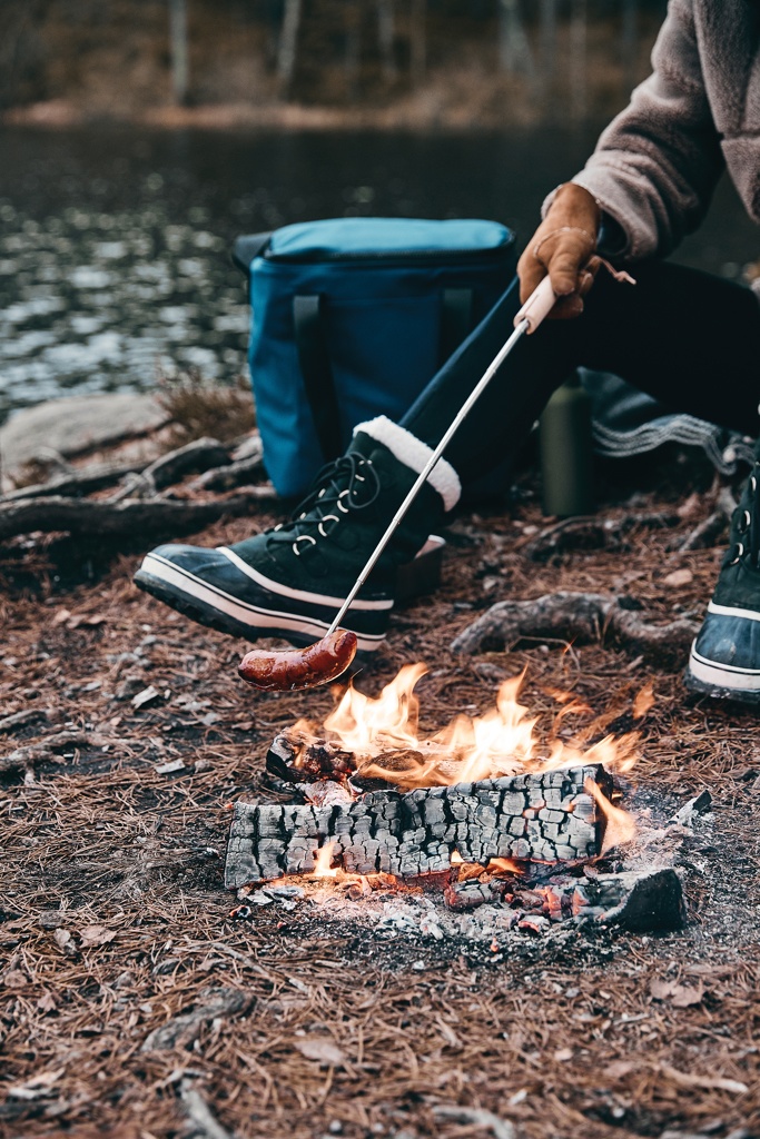 Teleskooppigrillitikku on omiaan avotulessa. Haarukan päissä väkäset, joiden ansiosta grillattava ei putoa tikusta. Puukahva. Kätevä nahkalenkki helpottaa ripustamista. Pituus ulosvedettynä n. 70 cm.