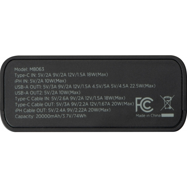 Virtapankki pikalataustoiminnolla, kapasiteetti 20 000 mAh. Siinä on 2x USB-portti ja 2x Type C -portti, sisäänrakennettu Type C- ja Lightning-kaapeli sekä digitaalinen näyttö.