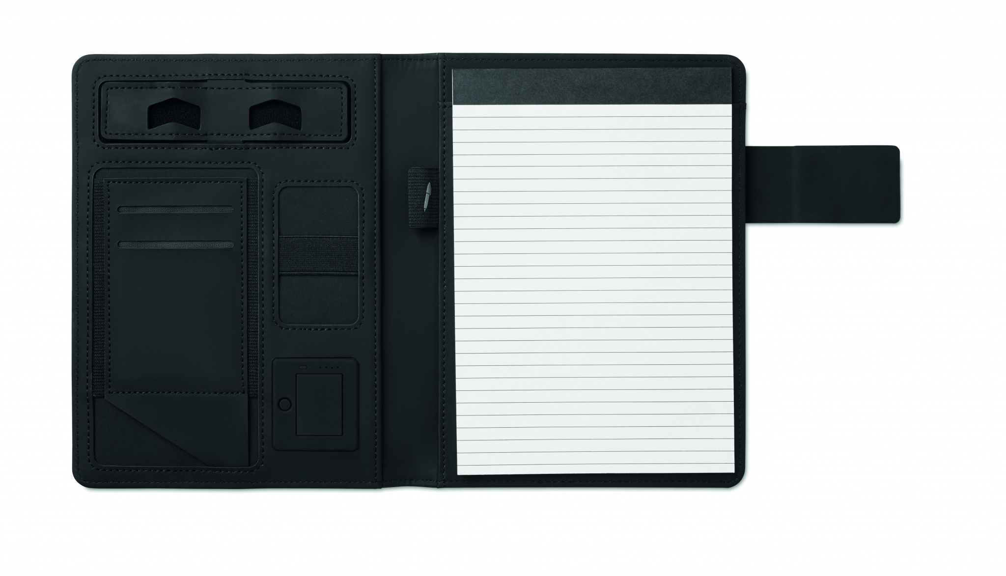 A5 konferencijų aplankas su lininiu-PU dangteliu. 4000 mAh maitinimo blokas. Integruotas mikro USB prie C tipo jungties. 20 linijuotų lapų bloknotas. Keli vidiniai skyriai. Magnetinis uždarymas. Elastinis rašiklio laikiklis.