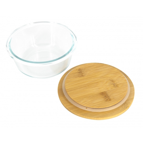 Universāla bļoda no borsilikāta stikla ar droši aizveramu bambusa vāku un iepildīšanas ietilpību 300 ml. Jūsu logotips tiks iegravēts uz vāka.