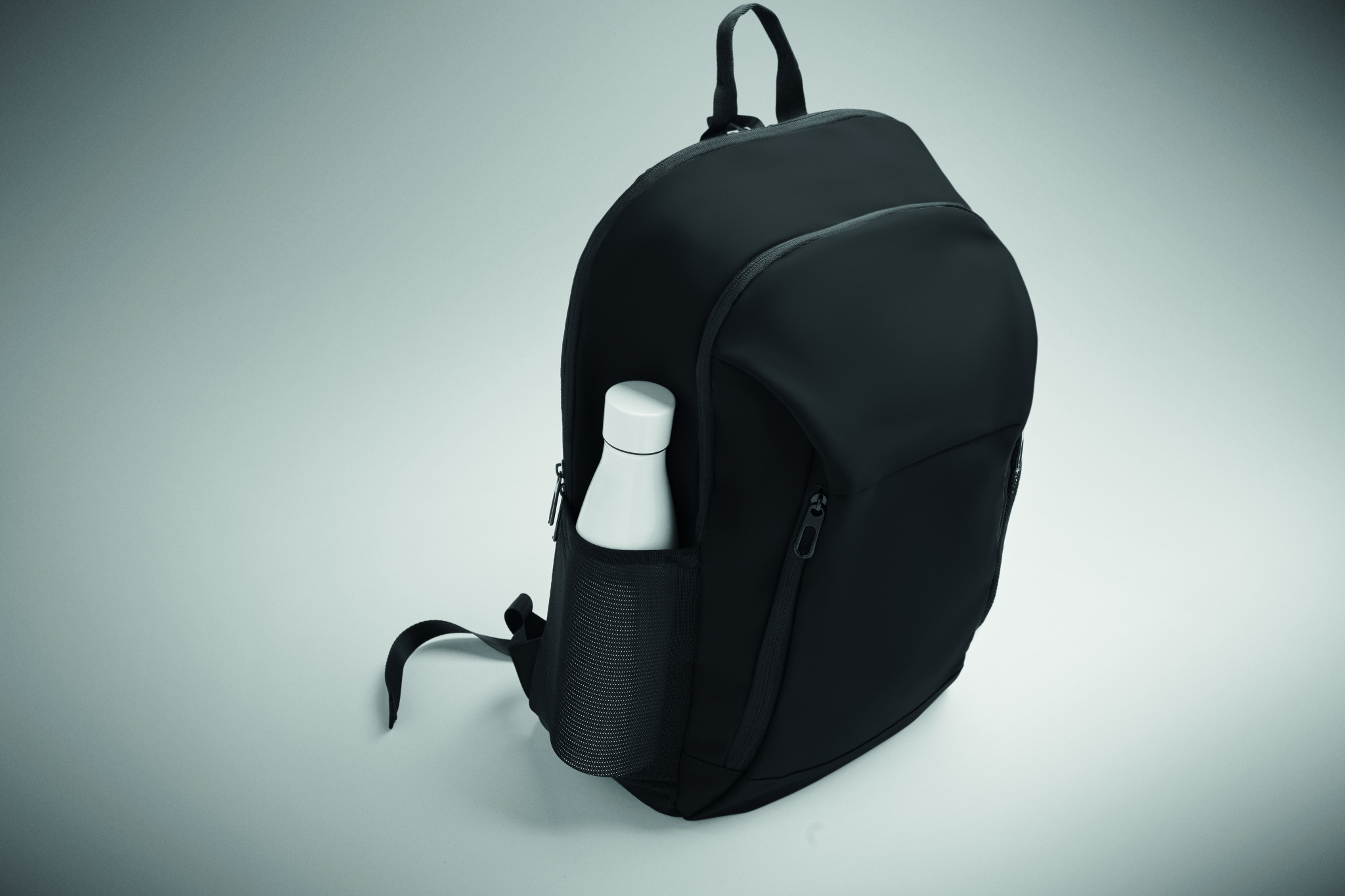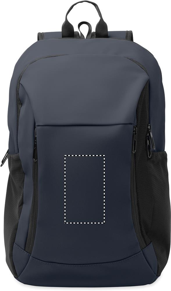 15 inch laptop backpack in soft PU with padded back and hidden zippered main compartment. 1 zippered front pocket, 2 front side zippered pockets and 2 elastic mesh side pockets. With 210D RPET lining.