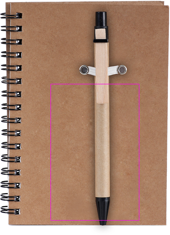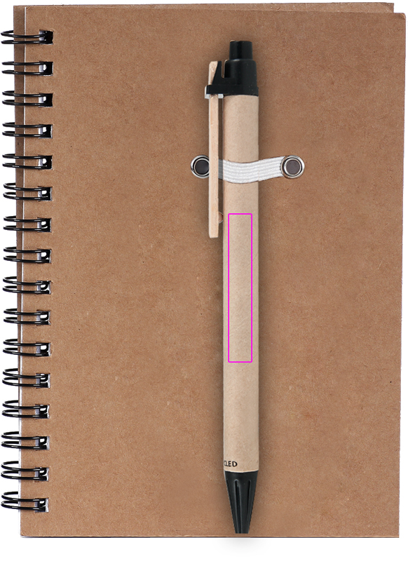 Блокнот из переработанного картона со 120 страницами из переработанной бумаги и шариковой ручкой с синими чернилами. Мы напечатаем ваш логотип на обложке.