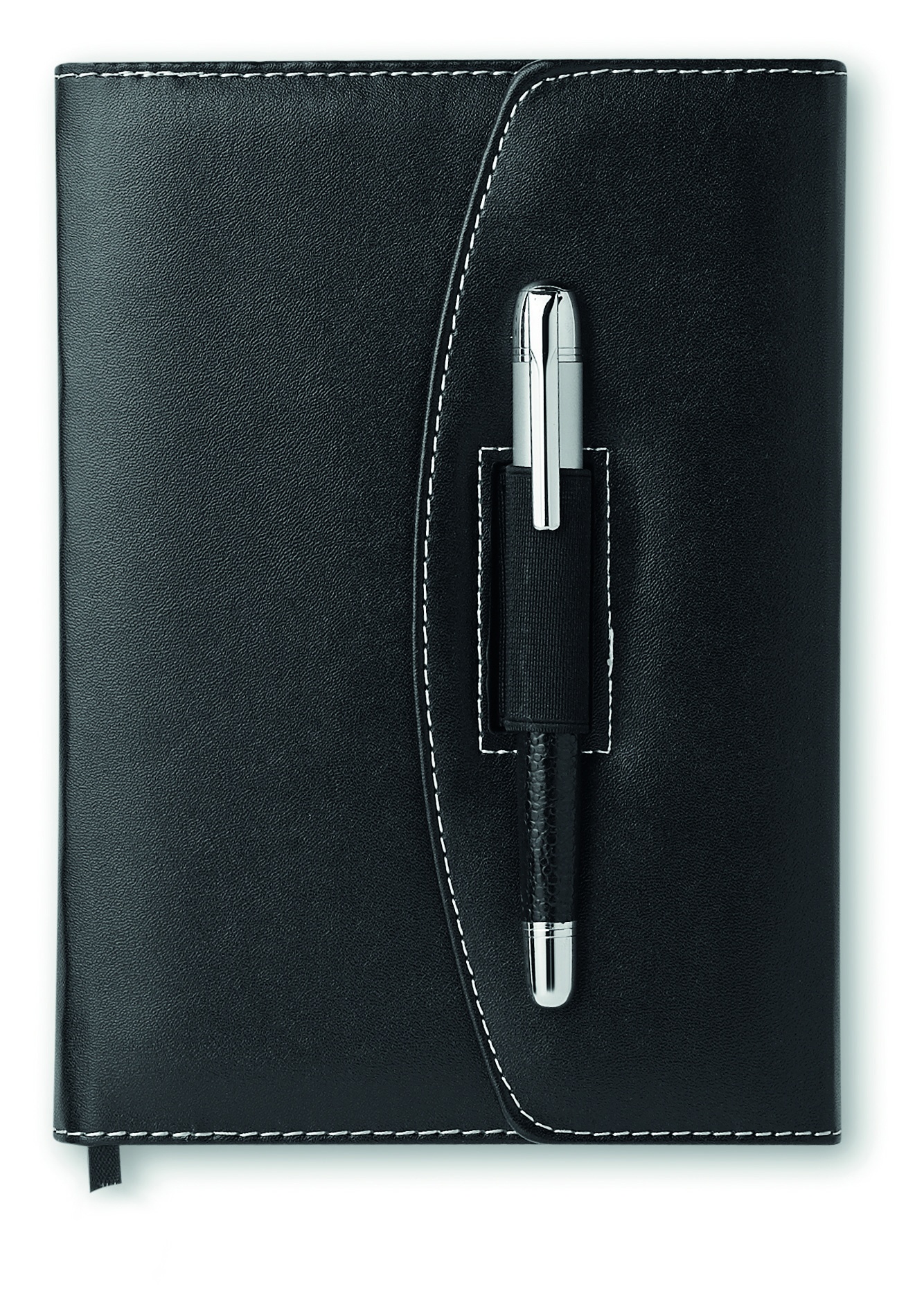 Блокнот формата А5 из искусственной кожи с контрастной строчкой. 120 листов линованной бумаги и металлическая ручка с черными чернилами.