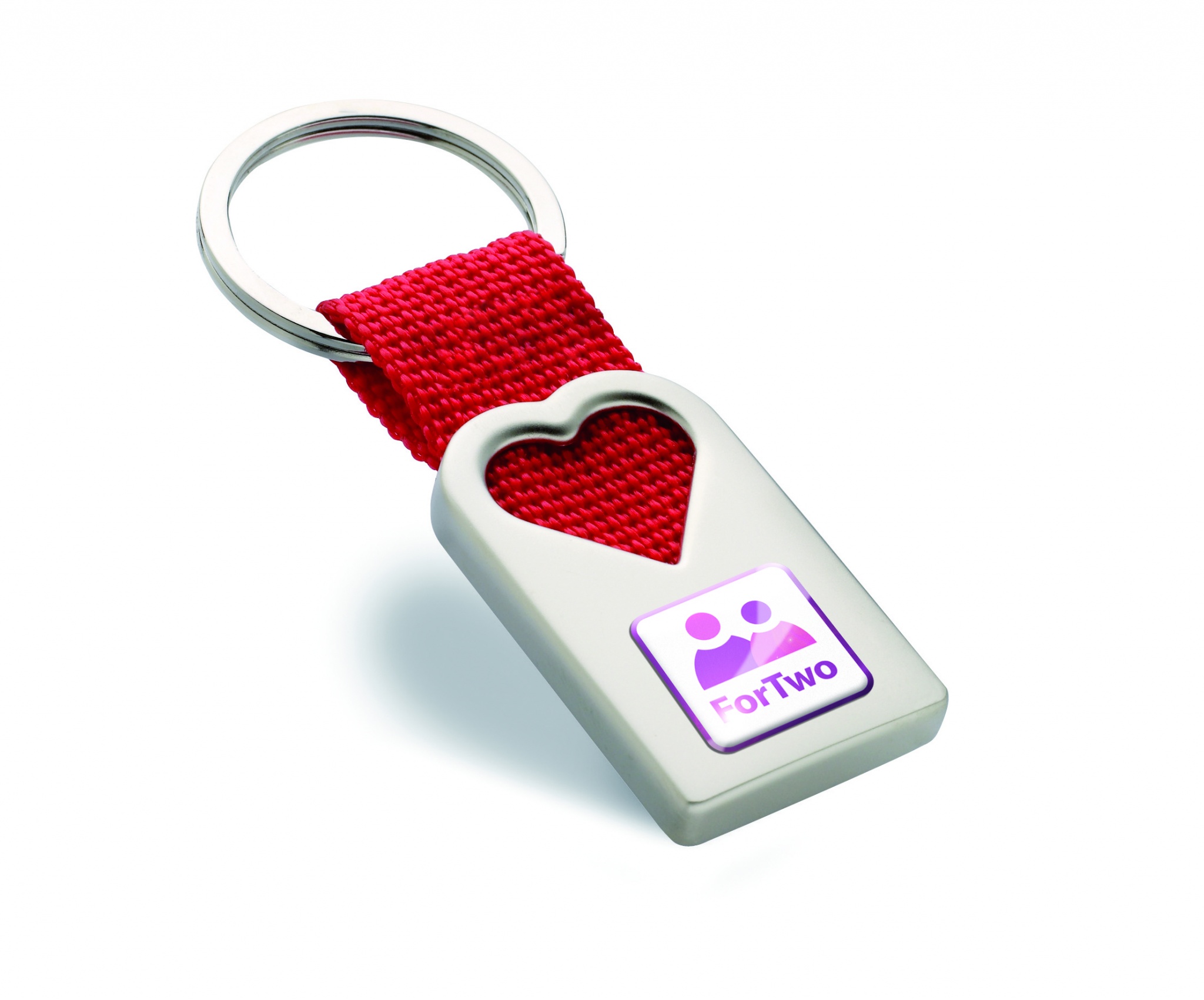 Металлический брелок для ключей с прорезью в виде сердечка и красным текстильным ремешком.