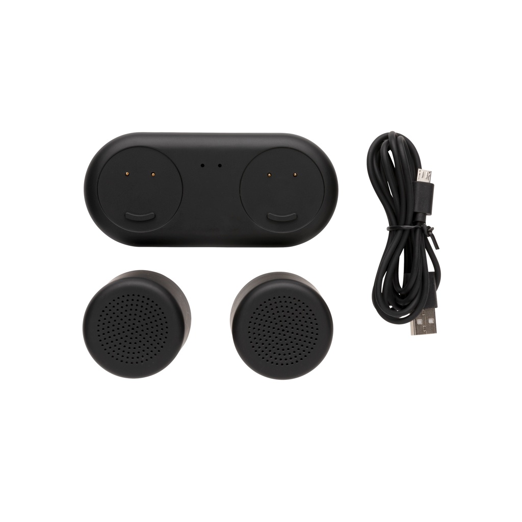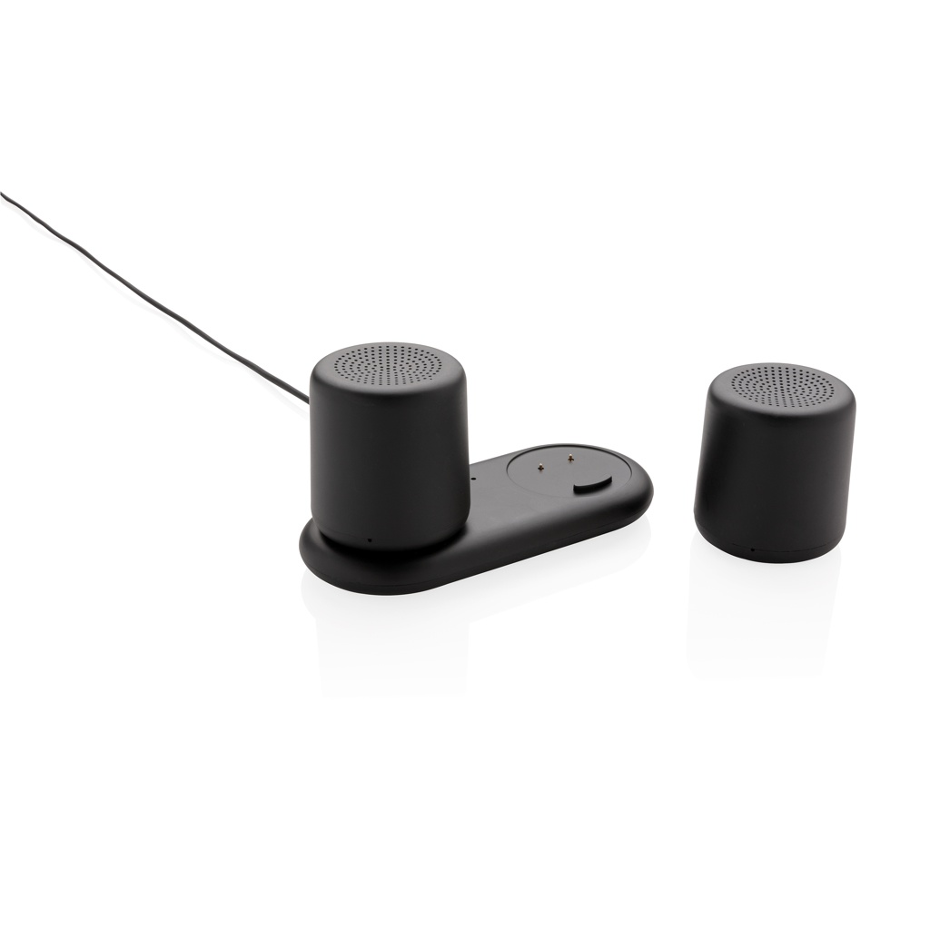 2 динамика мощностью 3 Вт, которые можно соединить для получения великолепного стереозвука. Разместите динамики в любом месте, чтобы получить великолепное звучание. Динамики ABS можно заряжать, просто поместив их на зарядную базу. Не нужно подключать провода! Оба динамика оснащены аккумулятором емкостью 300 мАч, что обеспечивает время воспроизведения до 2 часов. BT 4.2 для рабочего расстояния до 10 метров. В комплект входит кабель micro USB длиной 120 см для размещения базы на столе или на столе.