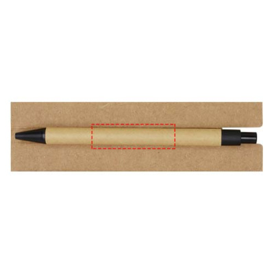 Липкий блокнот с шариковой ручкой. В блокноте 30 листов белой линованной бумаги плотностью 70 г/м2 (8 x 12 см). В комплект также входят 25 разноцветных (5 x 1,2 см) и 25 желтых (7,5 x 7,5 см) клейких листочков, оба типа на бумаге плотностью 70 г/м2. Корпус шариковой ручки изготовлен из переработанной бумаги. Цвет чернил: черный. Длина непрерывной линии: 1000 метров. Размер пера: 1,00 мм.