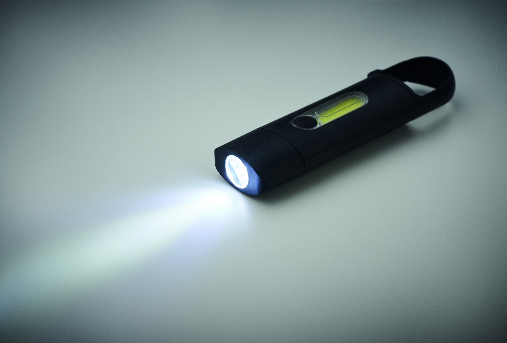 Карманный перезаряжаемый светодиодный фонарик с карабином из пластика. Аварийный режим свечения и 3 режима освещения.