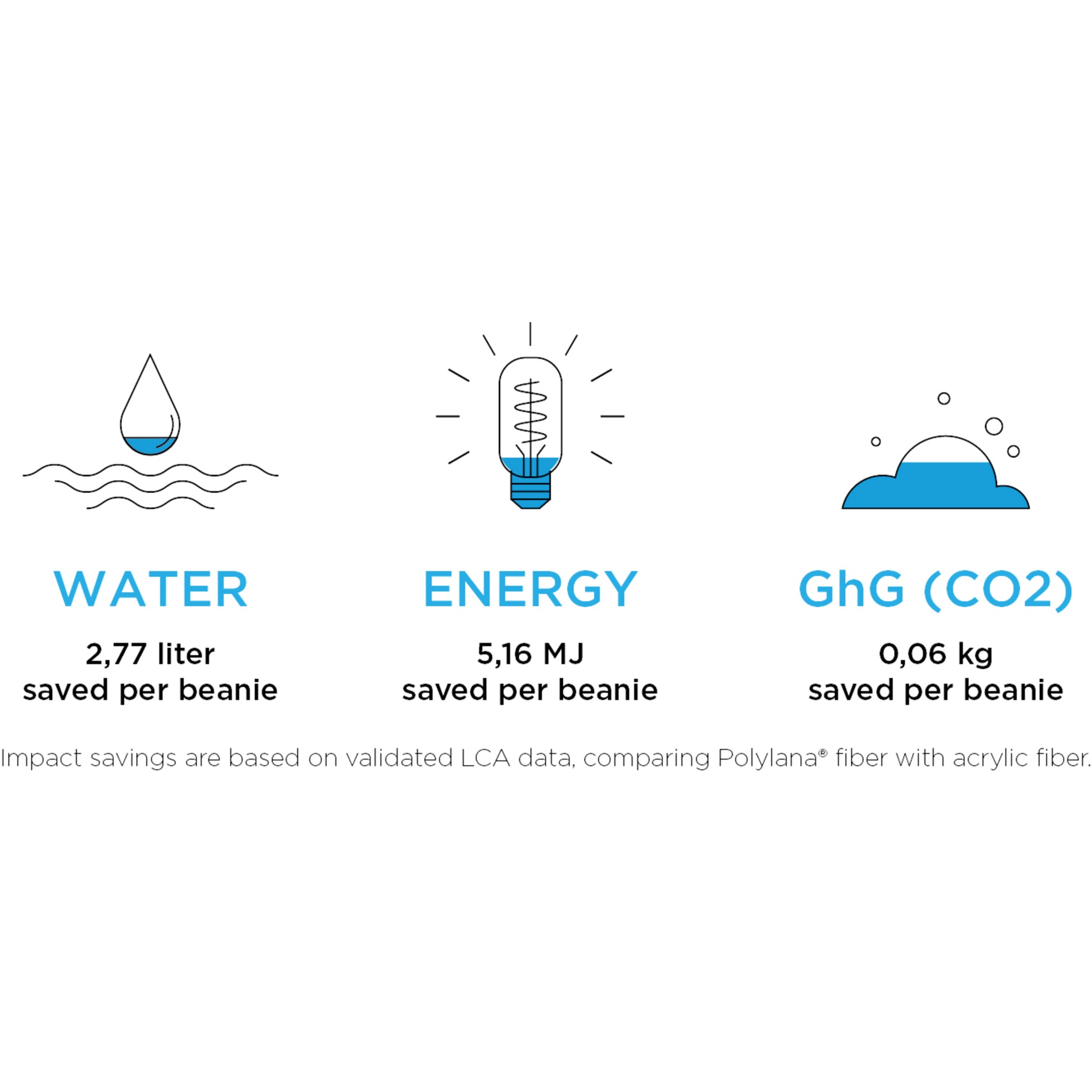 Бини Hale изготовлены из волокна Polylana® - малозатратной альтернативы 100% акриловым и шерстяным волокнам, что позволяет экономить воду, энергию и сокращать выбросы CO2 в процессе производства и окрашивания. По сравнению с акриловым волокном, каждая модель Hale beanie экономит: 2,77 литра воды, 5,16 МДж энергии и 0,06 кг парниковых газов (CO2). Экономия воздействия основана на подтвержденных данных оценки жизненного цикла (LCA). Изготовлена из трикотажа 1x1 rib с использованием волокна Polylana® и акрила плотностью 12 г. Идеальный выбор для тех, кто ценит моду и заботится об окружающей среде.