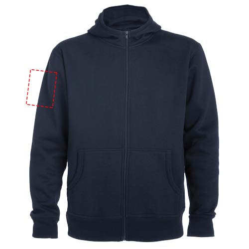 Худи с капюшоном, высоким воротником и полноразмерной молнией. Окантовка капюшона и карманов из ткани в рубчик. Карман-кенгуру. Манжеты рукавов и низ в рубчик 2 x 2. Съемная этикетка.