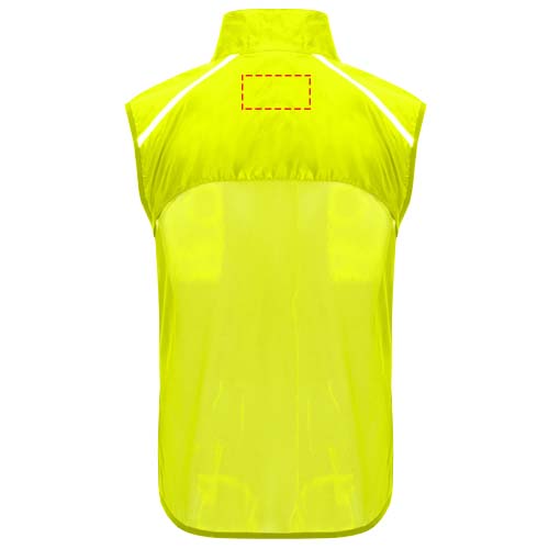 Ветрозащитный и дышащий. Передняя молния с защитой подбородка в тон. Эластичная окантовка в пройме и по низу. Нижняя часть спины из ткани с микроперфорацией. Яркие детали сверху, спереди и сзади. Карман с эластичным ремешком, позволяющий сложить жилет и носить его на запястье. Съемная этикетка.
