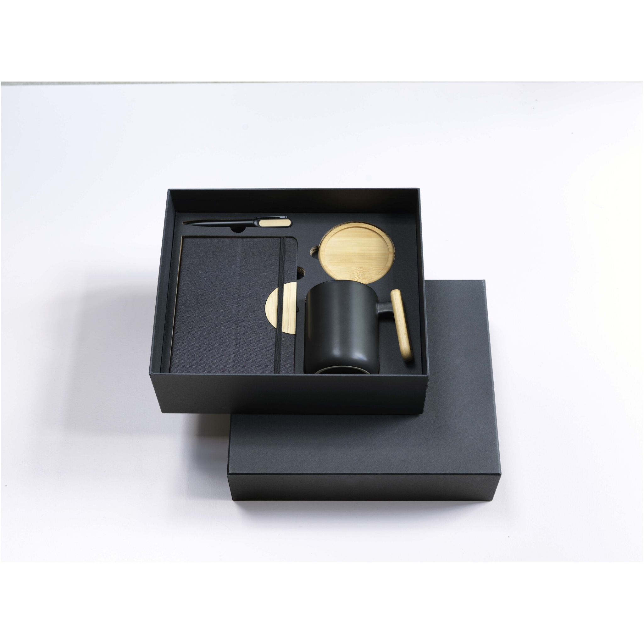 В подарочный набор Laura входит блокнот в твердой обложке RPET формата A5, шариковая ручка, керамическая кружка и подставка. Блокнот имеет черную эластичную застежку и ленточную закладку, а также 80 разлинованных листов бумаги плотностью 80 г/м² кремового цвета. Чехол для ноутбука вместе с бамбуковым полукругом выполняет функцию подставки для телефона. Шариковая ручка изготовлена из переработанного алюминия, сертифицированного RCS, с черным напылением и имеет бамбуковые аксессуары с обеих сторон верхнего корпуса. Чернила для ручки: черный. Длина непрерывной линии: 400 метров. Керамическая кружка объемом 480 мл поставляется с бамбуковой подставкой. Мыть только вручную. Размер кружки: 11 х 12,7 см. Диаметр подставки: 9,5 см. Размер подарочной коробки: 32 x 27 x 10,3 см.