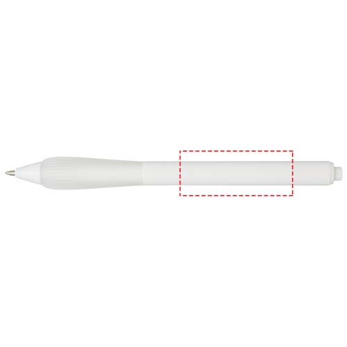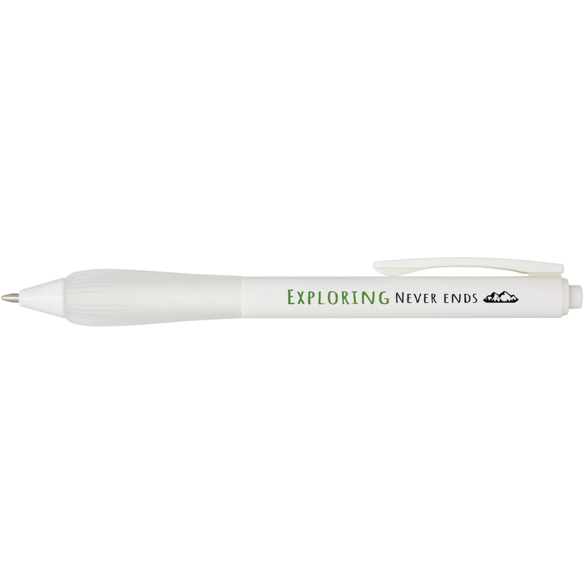 Шариковая ручка из переработанного пластика с прорезиненным корпусом и рукояткой из TPR. Цвет чернил: синий. Длина непрерывной линии: 1000 метров. Размер пера: 1,0 мм.